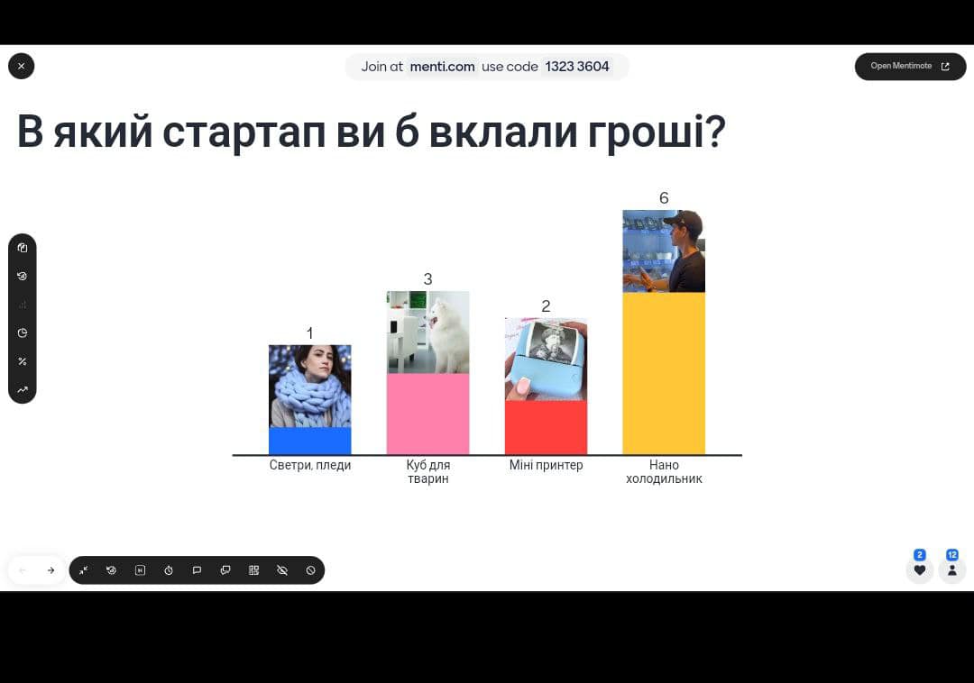 І ось головний кульмінаційний момент: всі студенти, що були присутні на занятті виступали в ролі інвесторів! Вони визначали, які команди отримають фінансову підтримку, голосуючи своїми “грошима” за найкращі ідеї.