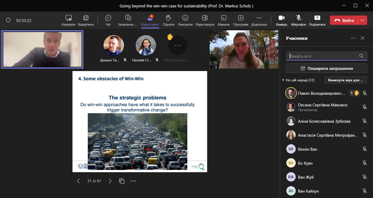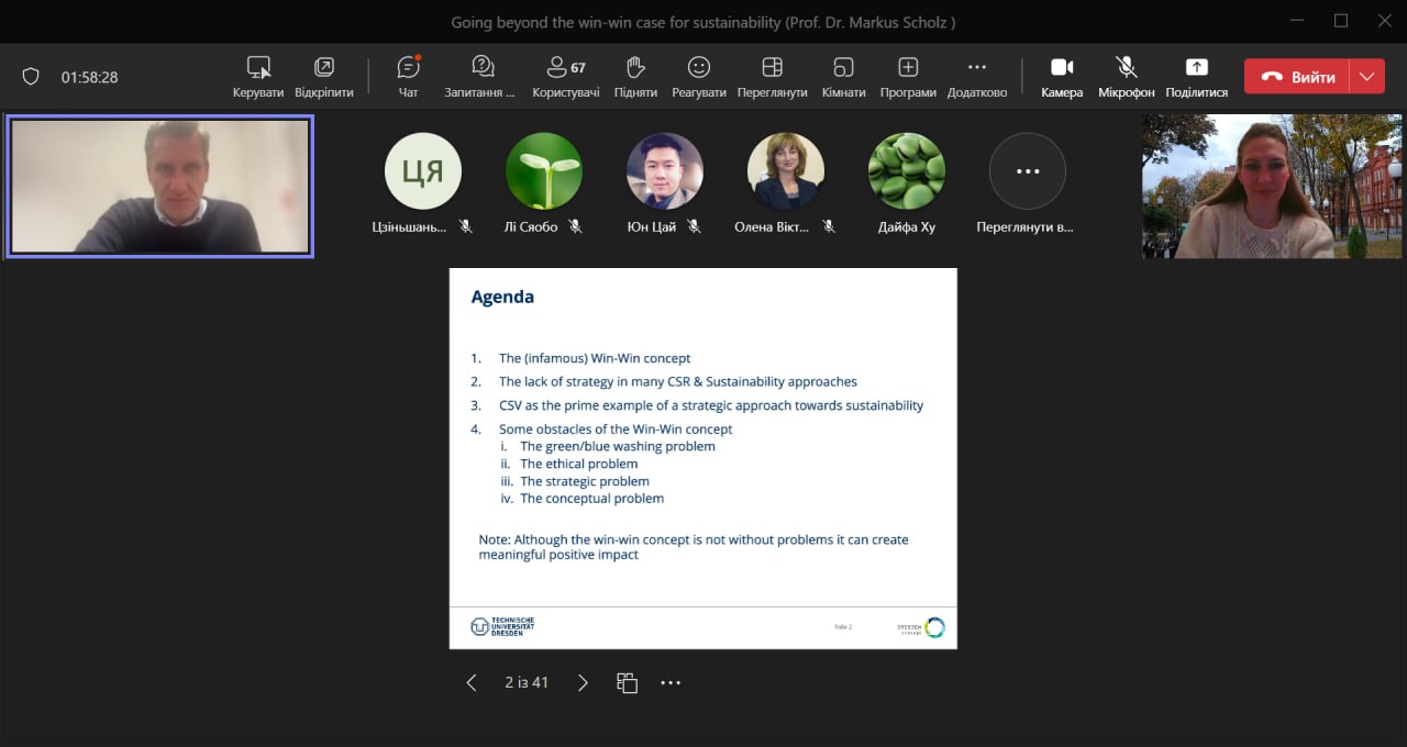 23 листопада професор Міжнародного інституту Циттау (IHI Zittau) Технічного університету Дрездена Маркус Шольц (Prof. Dr. Markus Scholz) провів гостьову лекцію для здобувачів кафедри менеджменту НТУ «ХПІ» на тему «Going beyond the win-win case for sustainability».