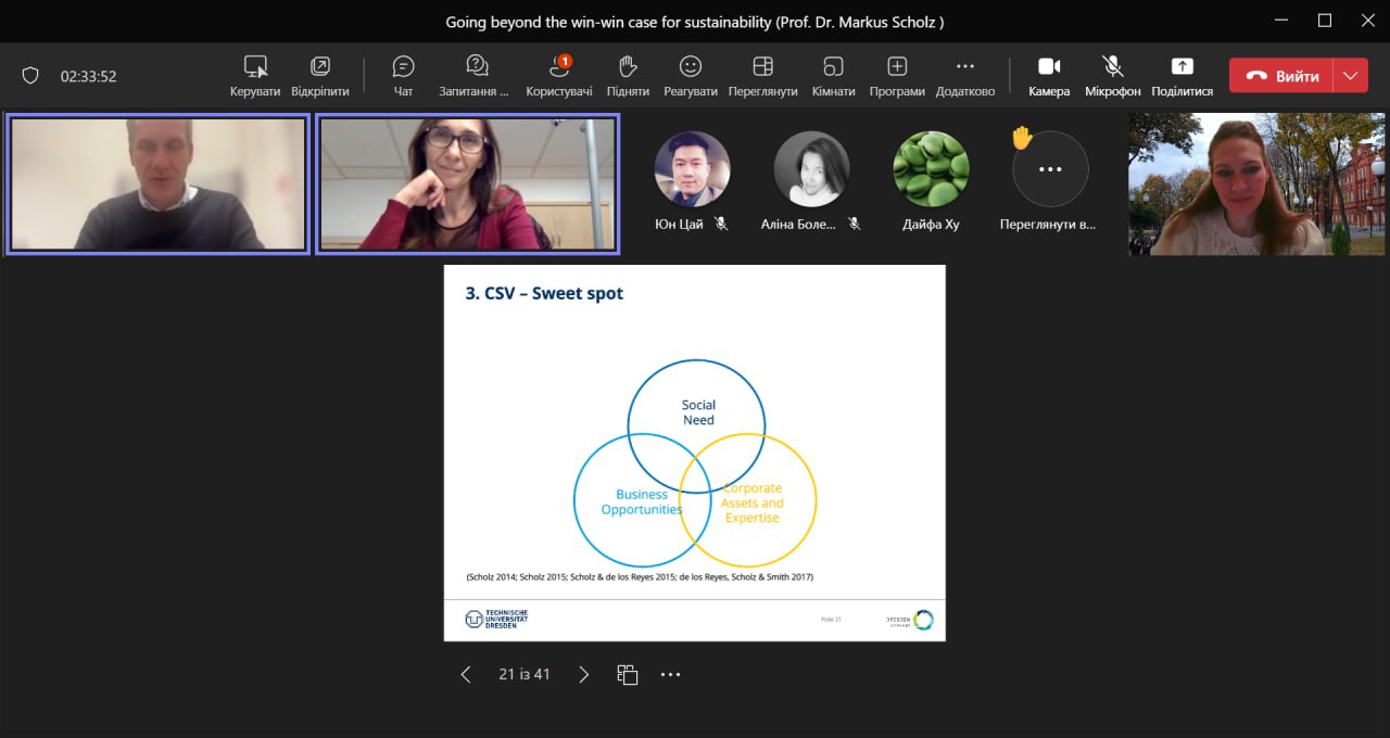 Під час лекції було розглянуто актуальні проблеми стратегічного управління сталим розвитком, проведено аналіз стійких змін та інновації. Також розглядалися такі питання, як компанії та права людини, політичні зобов’язання та політична відповідальність компаній, особливо на тлі культурних, екологічних і технологічних змін у суспільстві.
