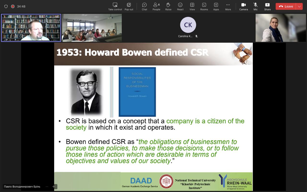 В рамках Літньої школи-2024 в Rhine-Waal University of Applied Sciences (Німеччина) професор кафедри Павло Брінь провів лекцію та воркшоп на тему «History the of Sustainable Development Concept: From Charity to the Source of Sustainable Competitive Advantage».