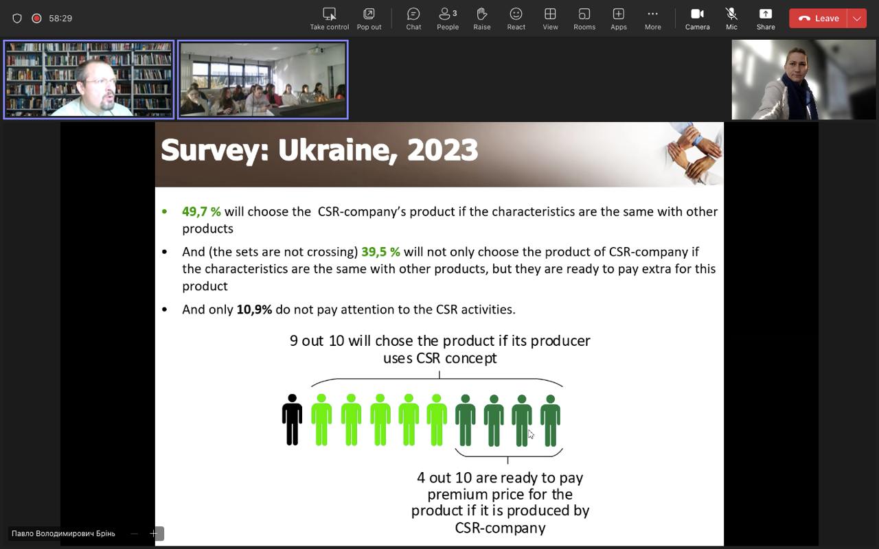 Слухачі мали змогу дізнатися, що корпоративна соціальна відповідальність (КСВ) допомагає підвищити конкурентоспроможність підприємства, адже позитивно впливає на його репутацію та довіру з боку споживачів. Компанії, які підтримують соціальні та екологічні ініціативи, частіше залучають лояльних клієнтів і талановитих працівників. КСВ також сприяє скороченню витрат, підвищуючи ефективність використання ресурсів і впроваджуючи інновації. Відповідальне ведення бізнесу зміцнює відносини з партнерами та державою, що розширює можливості для розвитку.