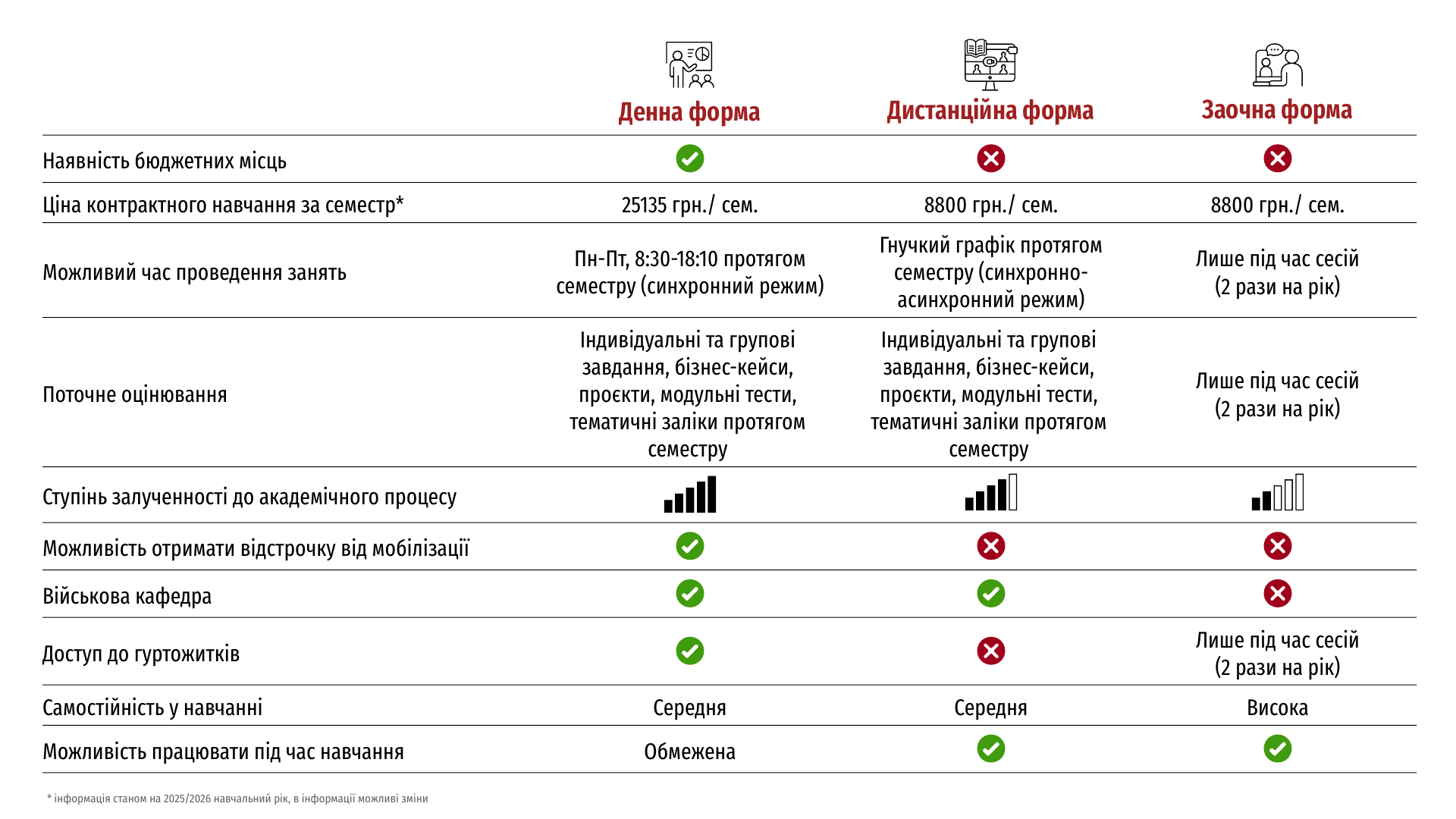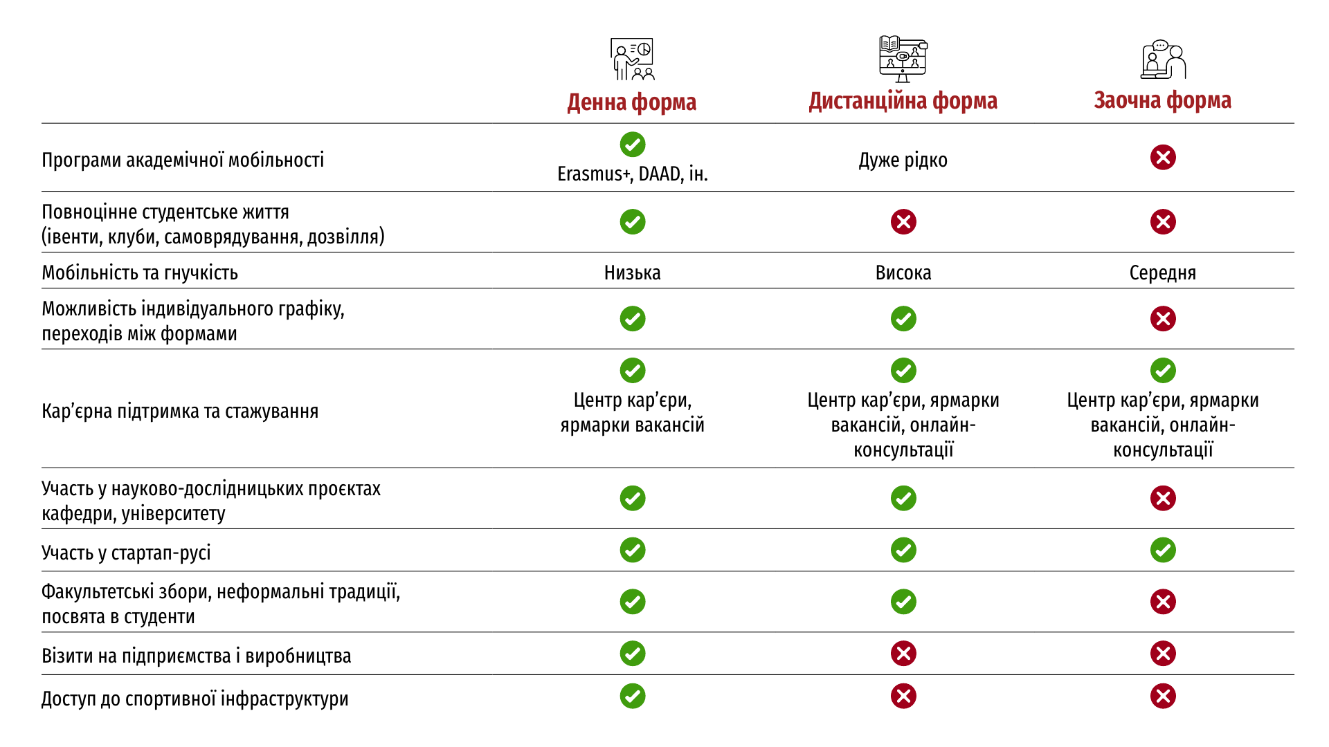 Більш детальне порівняння денної, дистанційної та заочної форм навчання ви можете побачити у таблицях нижче: