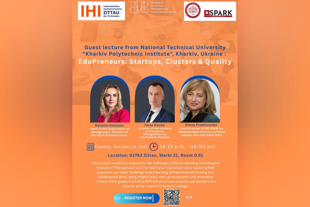 14 жовтня представники НТУ «ХПІ» проведуть інтерактивну лекцію «EduPreneurs: Startups, Clusters & Quality» в Міжнародному інституті Циттау (IHI Zittau) Технічного університету Дрездена, де вони знаходитимуться з візитом з 13 по 17 жовтня.