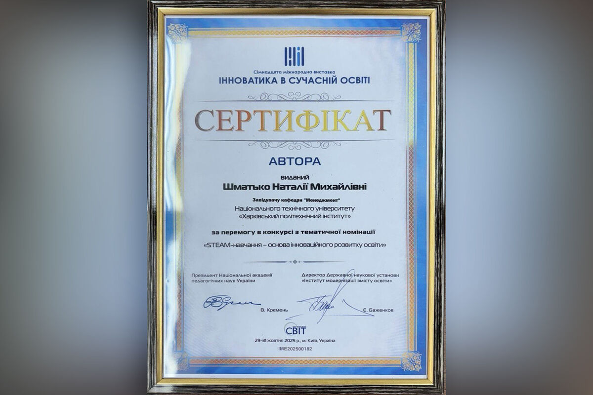 Завідувачка кафедри менеджменту НТУ «ХПІ», д.е.н., проф. Наталія Шматько у разом з колегами Харківського Політеху отримала золоту медаль на 17-й Міжнародній виставці «Інноватика в сучасній освіті» за  розробку методичних рекомендацій щодо синергії STEAM-освіти та університетської інноваційної екосистеми сталого розвитку.