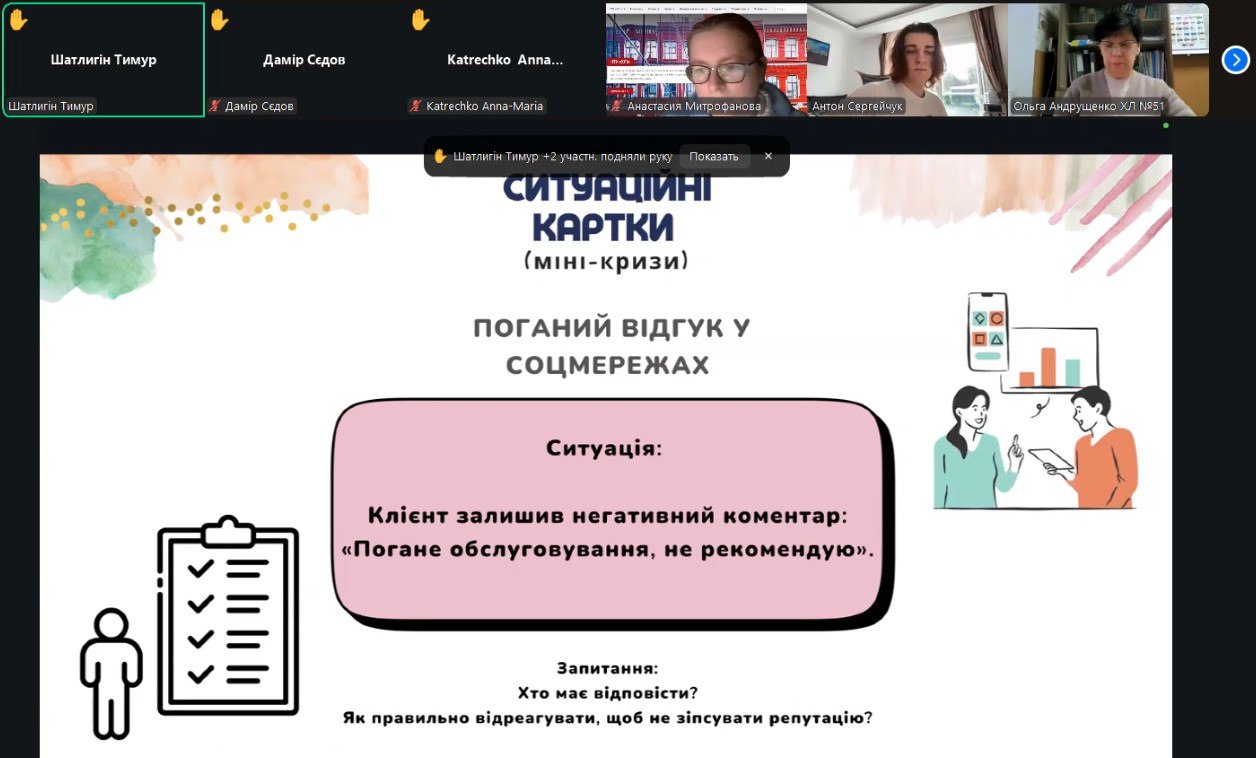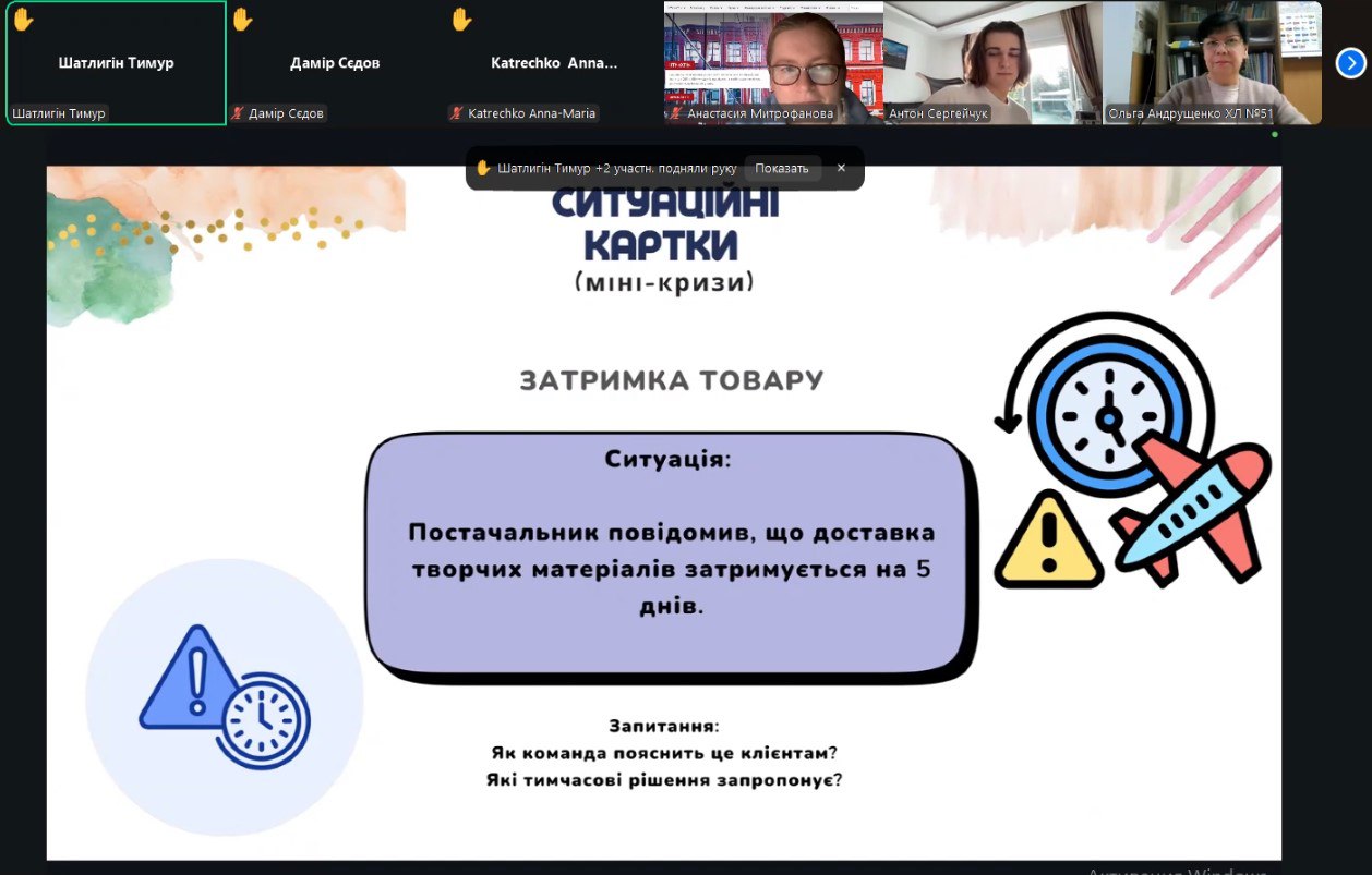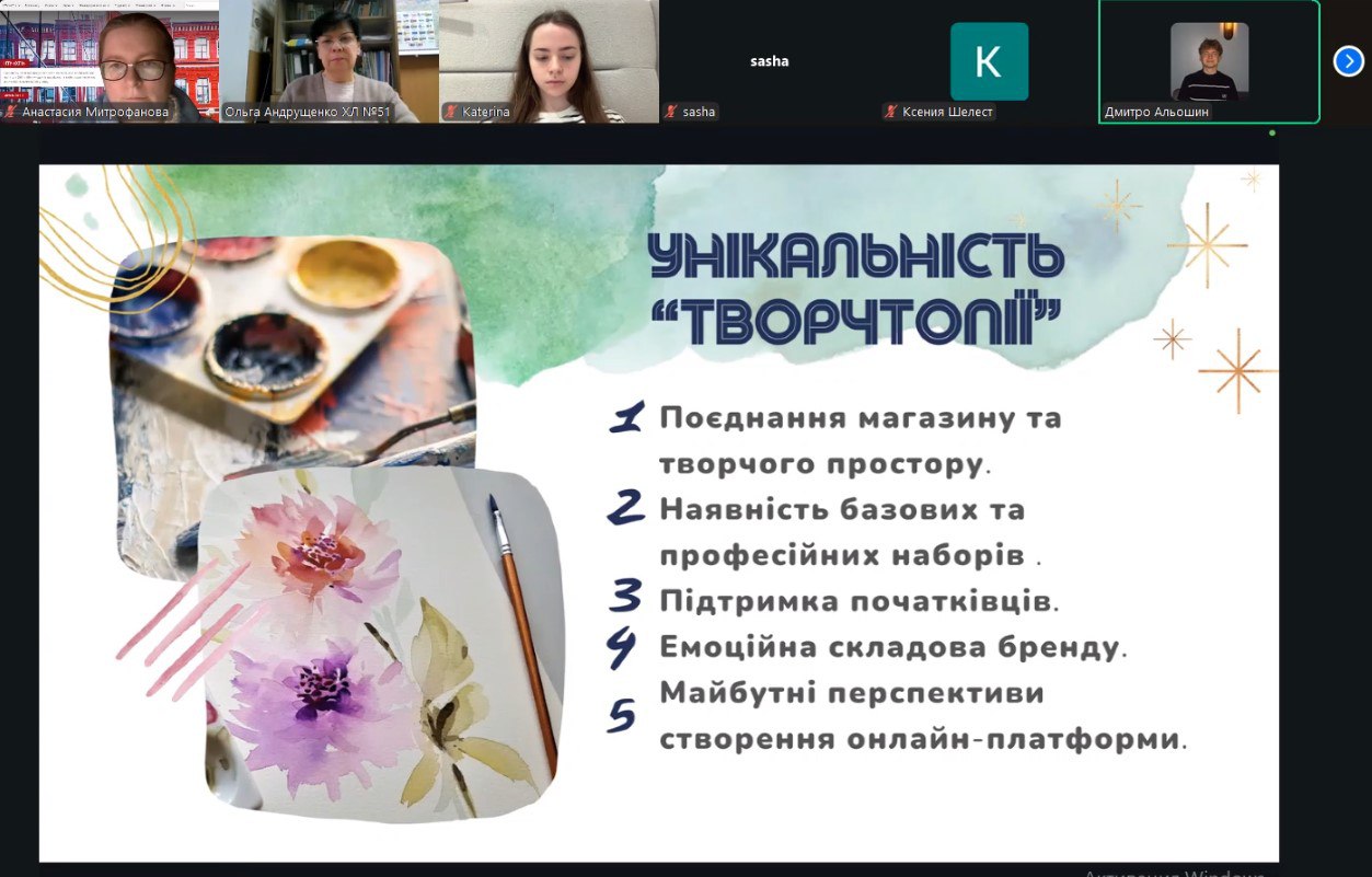 24 листопада 2025 року доцент кафедри менеджменту Анастасія Митрофанова провела онлайн-зустріч з учнями 10-х класів Харківських ліцеїв №51 та №89. Захід пройшов у форматі тренінгу з розробки бізнес-ідеї. Свою унікальну бізнес-ідею магазину товарів для майстерності під назвою «Творчтопія» представили студенти 4 курсу кафедри менеджменту Катерина Тимоха, Дмитро Альошин, Олександра Козлова, Антон Сергійчук, Ксенія Шиман.