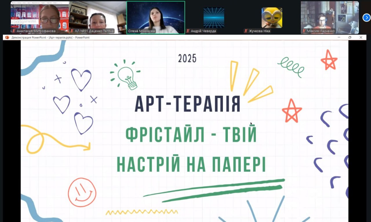 3 грудня 2025 року доцент кафедри менеджменту НТУ «ХПІ» Анастасія Митрофанова провела онлайн-зустріч з учнями 11-го класу Харківського ліцею №51. Захід відбувся у новому цікавому форматі – як тренінг з Арт-терапії під назвою «Фрістайл – твій настрій на папері».
