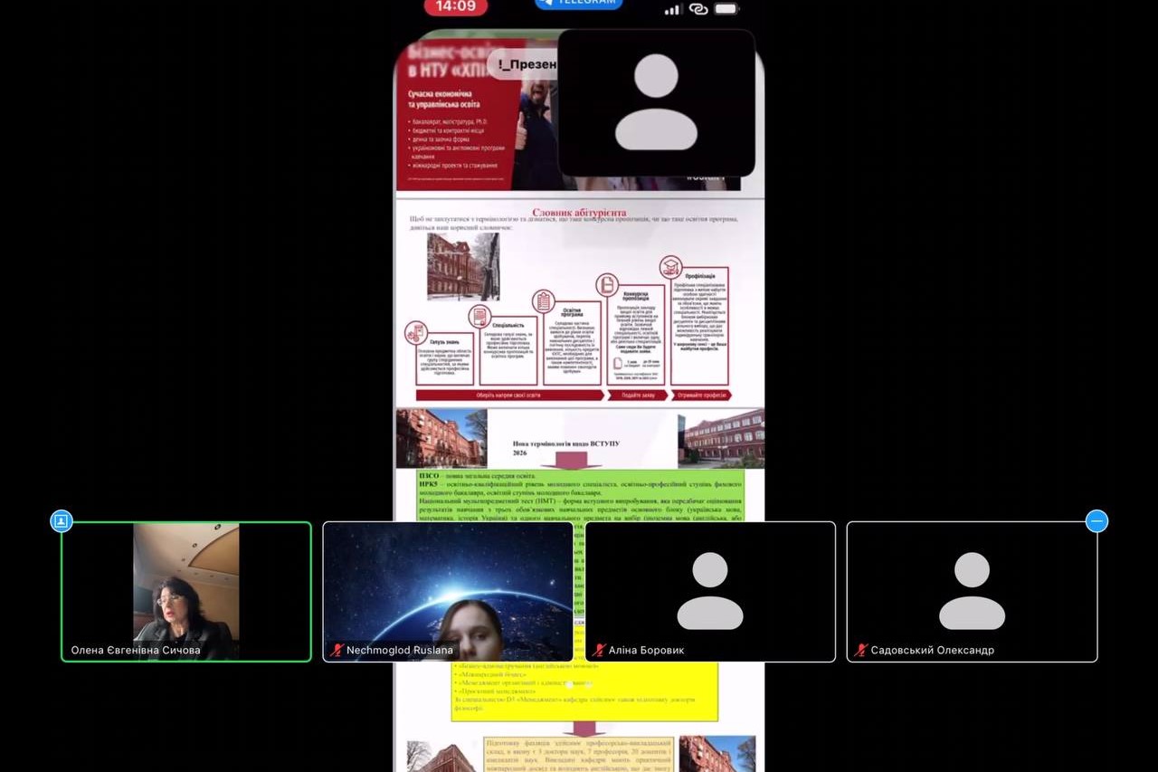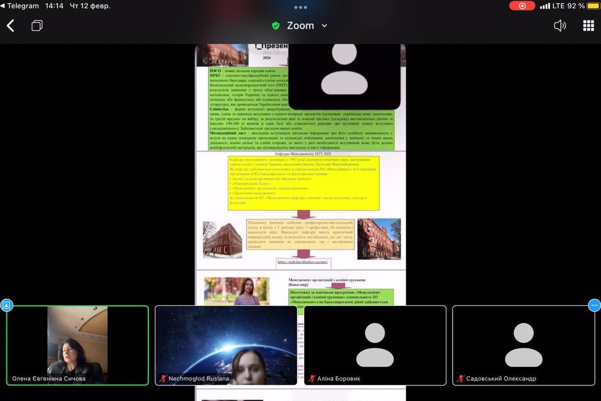 12 лютого 2026 року доцент кафедри менеджменту НТУ «ХПІ» Олена Сичова презентувала спеціальність D3 «Менеджмент» учням 11 класу Нововодолазького ліцею №2 Нововодолазької селищної ради Харківської області. Захід відбувся онлайн на платформі ZOOM.