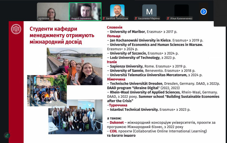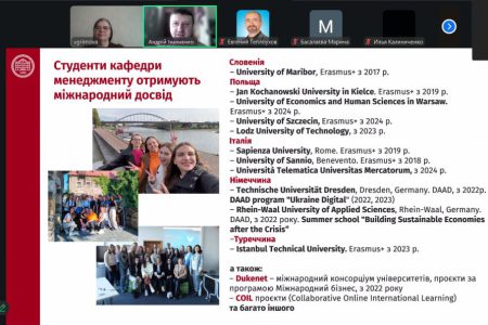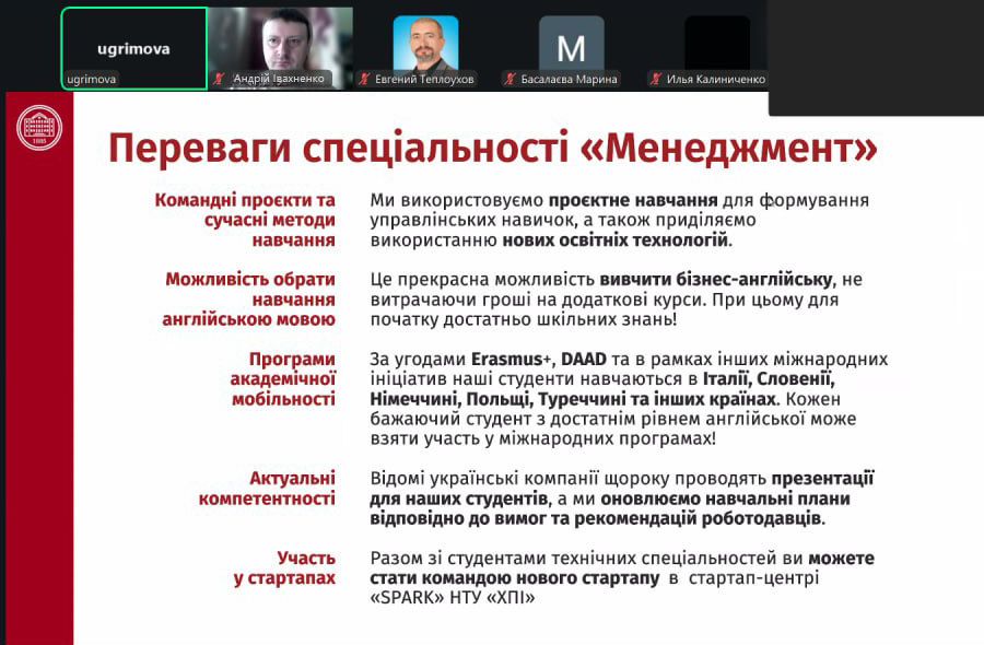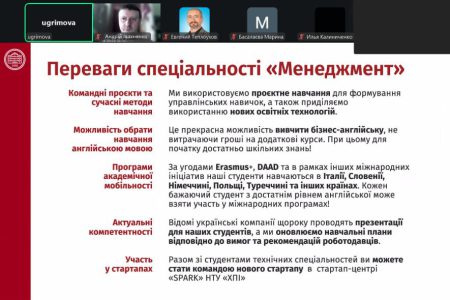 27 лютого 2026 року викладачами кафедри менеджменту НТУ «ХПІ» було проведено чергову онлайн-зустріч зі старшокласниками КЗ «Харківський ліцей №80». Кафедру представляли доценти Ірина Угрімова та Андрій Івахненко. Вони розповіли школярам про можливості бізнес-освіти в ХПІ та про освітні програми за спеціальністю D3 «Менеджмент»: «Менеджмент організацій і адміністрування», «Бізнес-адміністрування», «Міжнародний бізнес», «Проєктний менеджмент».
