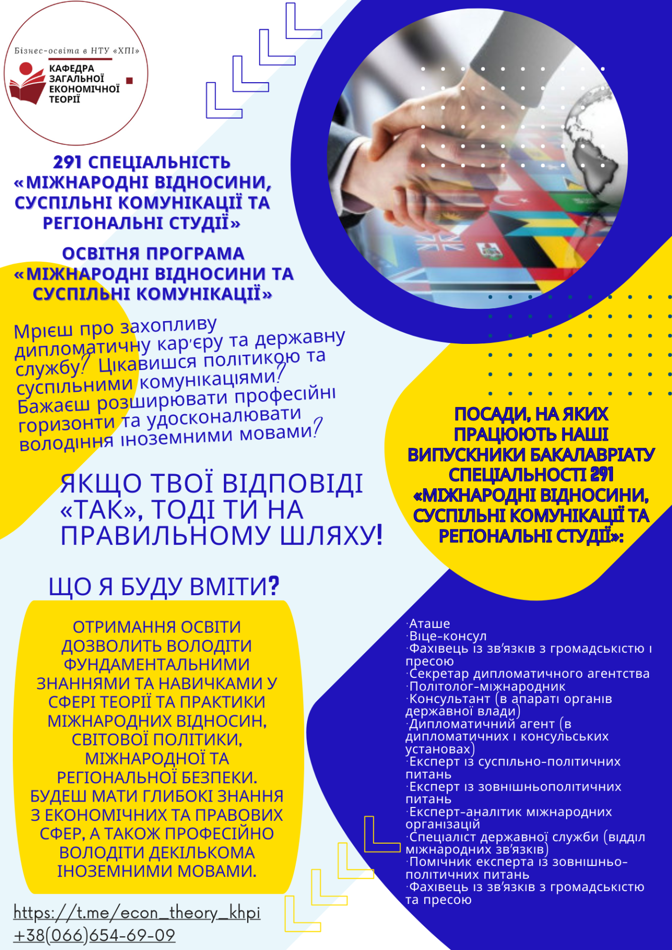 Спеціальність 291 – Міжнародні відносини, суспільні комунікації та регіональні студії виховує нове покоління дипломатів, аналітиків та комунікаторів, які своїми знаннями та вміннями сприяють єднанню країни, зміцненню міжнародних зв’язків та побудові сильної демократичної держави. Саме такі фахівці формують імідж України у світі, відстоюють наші національні інтереси та допомагають долати виклики. Сьогодні, як і сто років тому, наша сила – у єдності. Разом ми здатні подолати будь-які перешкоди, боронити нашу державу та творити майбутнє для кожного українця і кожної українки.