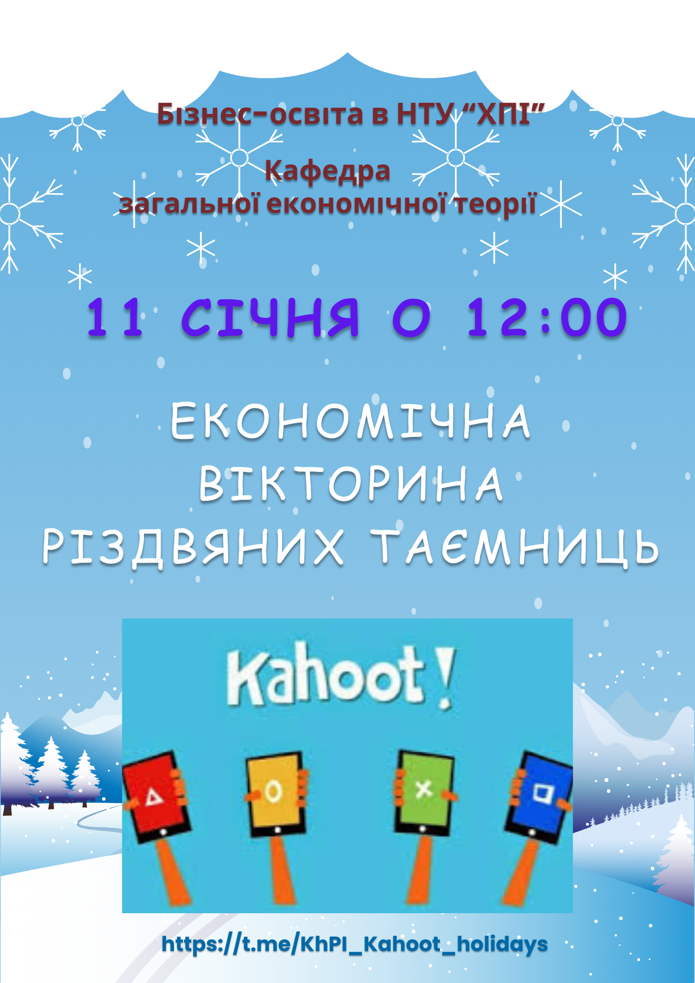 11 січня 2024 р. о 12.00 кафедра загальної економічної теорії ННІ ЕММБ запрошує абітурієнтів, школярів та друзів на цікаву гру у Kahoot «Економічна вікторина різдвяних таємниць».