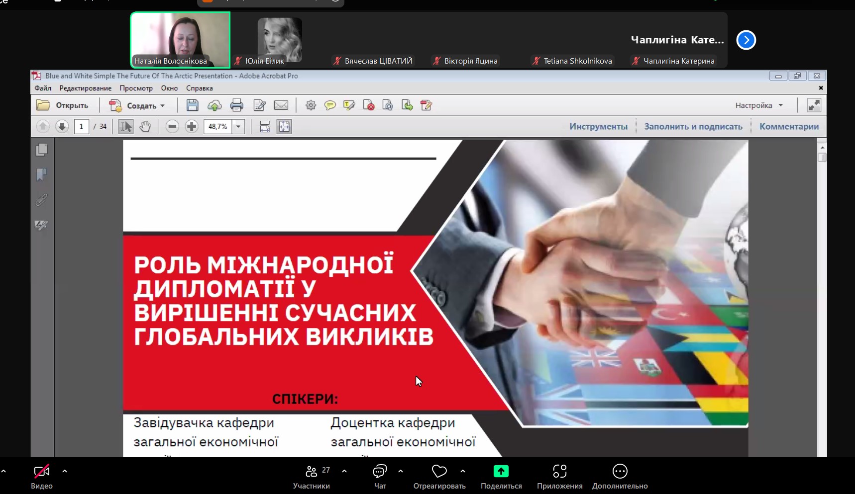 10 квітня Наталія Волоснікова (к.е.н., доцент, завідувачка кафедри загальної економічної теорії, організаторка проєкту «Дипломатична Україна») та Вікторія Яцина (к.е.н., доцент, керівниця студентського наукового гуртка «Студія публічної дипломатії») мали честь виступити з майстер-класом «Роль міжнародної дипломатії у вирішенні сучасних глобальних викликів» у межах ХХІІ Міжнародної школи-семінару «Сучасні педагогічні технології в освіті» (08-11 квітня 2025 р.).