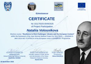 З 10 вересня по 25 листопада 2025 року студенти спеціальності «Міжнародні відносини» разом із завідувачкою кафедри к.е.н., доценткою Наталією Волосніковою взяли участь у навчальному курсі «Стійкість до небезпекових викликів: Україна та європейський контекст» (№101175025 — EUresissecur, Erasmus+ Jean Monnet Module).