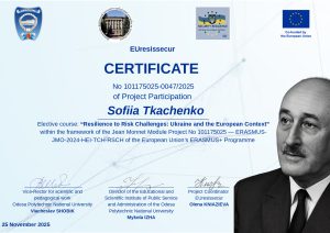 З 10 вересня по 25 листопада 2025 року студенти спеціальності «Міжнародні відносини» разом із завідувачкою кафедри к.е.н., доценткою Наталією Волосніковою взяли участь у навчальному курсі «Стійкість до небезпекових викликів: Україна та європейський контекст» (№101175025 — EUresissecur, Erasmus+ Jean Monnet Module).