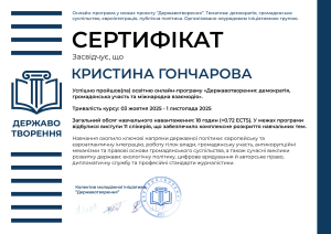 As part of the “State Building” project, our colleagues – Fedir Abramov, Nataliia Volosnikova, Viktoriia Yatsyna, Svitlana Klymova, Tetyana Dyachenko ang student Krystyna Goncharova- completed an intensive online course that covered key areas of modern state policy and civil society development.
