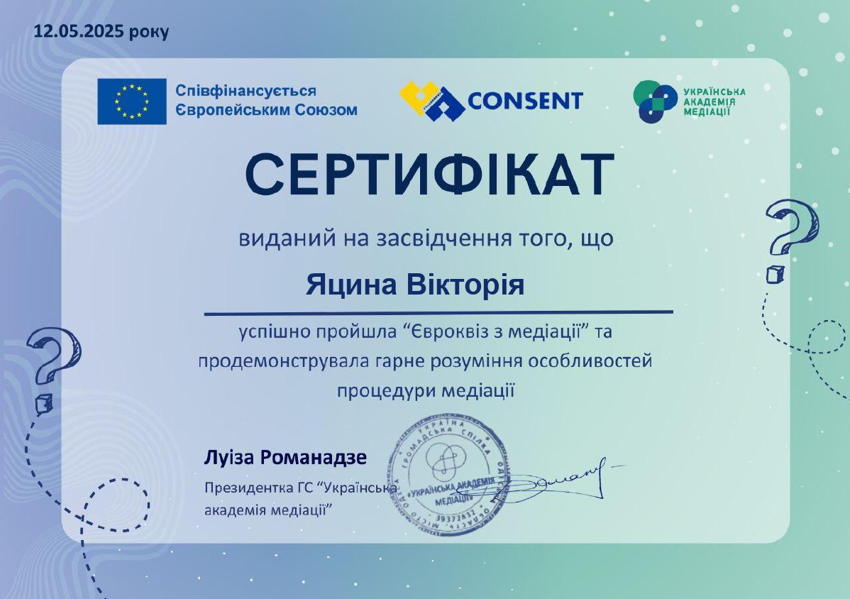 Наші студенти та викладачі — серед переможців Євроквізу з медіації! До Дня Європи ми долучилися до освітньої ініціативи — Євроквізу з медіації, організованого Українською академією медіації в межах проєкту «CONSENT» за підтримки Європейського Союзу. Результати вражають: учасники з честю пройшли випробування, продемонструвавши глибокі знання про медіацію — сучасний інструмент мирного врегулювання конфліктів. Це не просто чергова наша активність — це ще один крок до формування культури діалогу, порозуміння та співпраці, якої так потребує наше суспільство сьогодні.