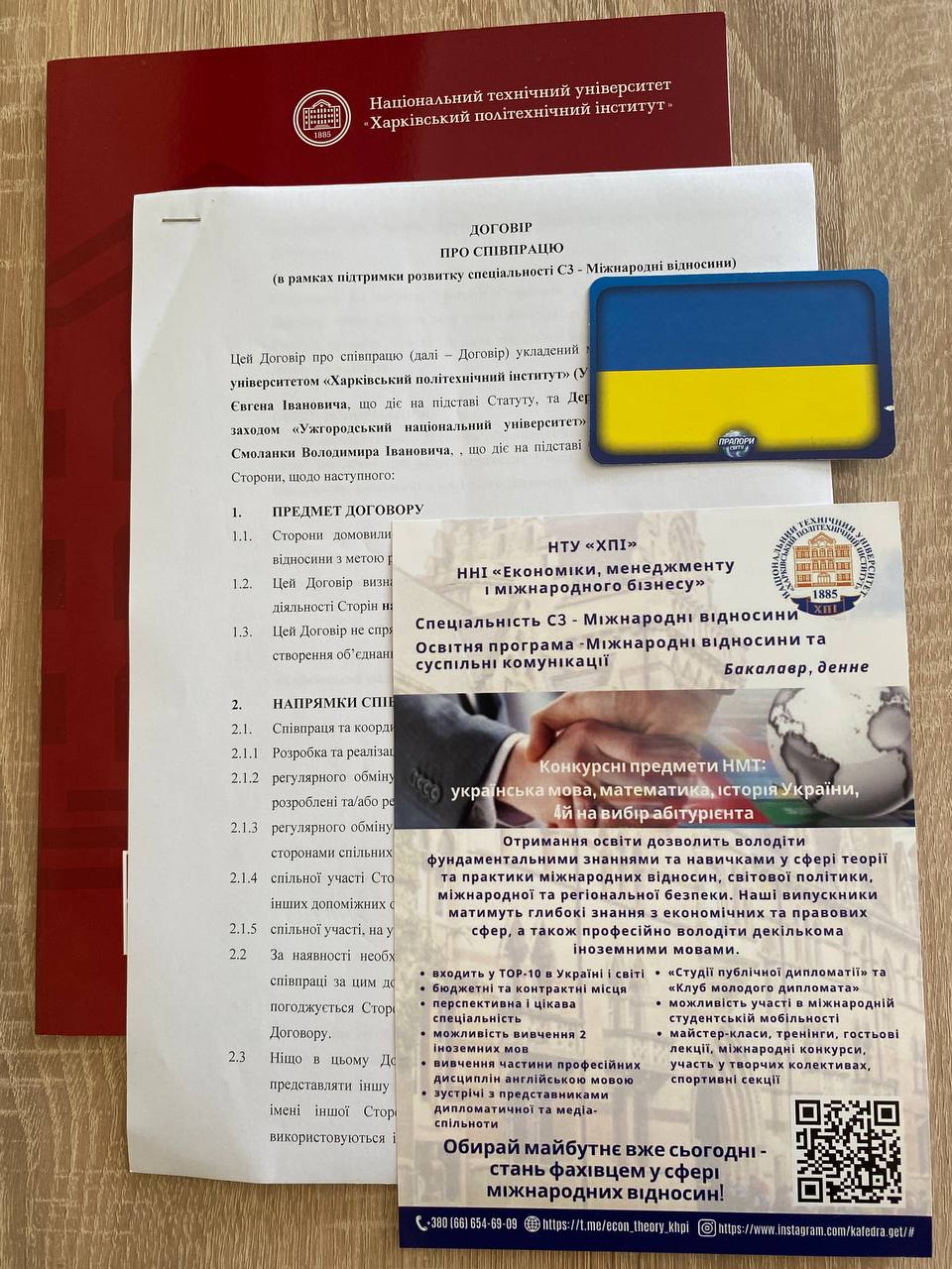 З нагоди Дня Європи повідомляємо, що цьогорічне святкування ми присвячуємо укладеному договору про партнерські відносини між НТУ «Харківський політехнічний інститут» та Державним вищим навчальним закладом «Ужгородський національний університет». Угода, підписана ректором НТУ «ХПІ» професором Євгеном Соколом і ректором ДВНЗ Ужгородський національний університет ректором Володимира Смоланки, спрямована на розвиток спеціальності С3 «Міжнародні відносини», а саме організацію спільних наукових заходів, конференцій та круглих столів; обмін досвідом у сфері управління освітнім процесом; підготовку наукових публікацій і реалізацію міжуніверситетських проєктів тощо, що відповідають духу європейської інтеграції.