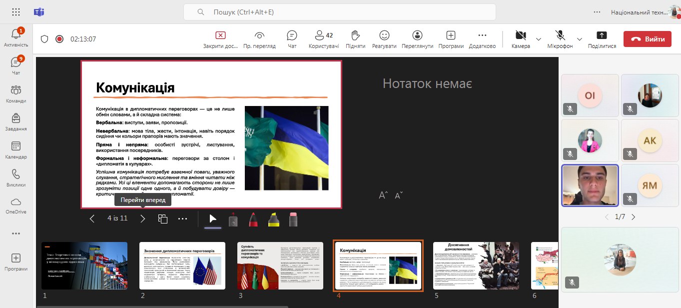 Особливо приємно, що студент нашої кафедри Іраклій Ломая взяв участь у пленарному засіданні з доповіддю на тему: «Теоретичні основи дипломатичних переговорів у міжнародних відносинах», де він розкрив ключові підходи до дипломатії як інструменту досягнення стратегічних цілей держави в глобальному просторі.
