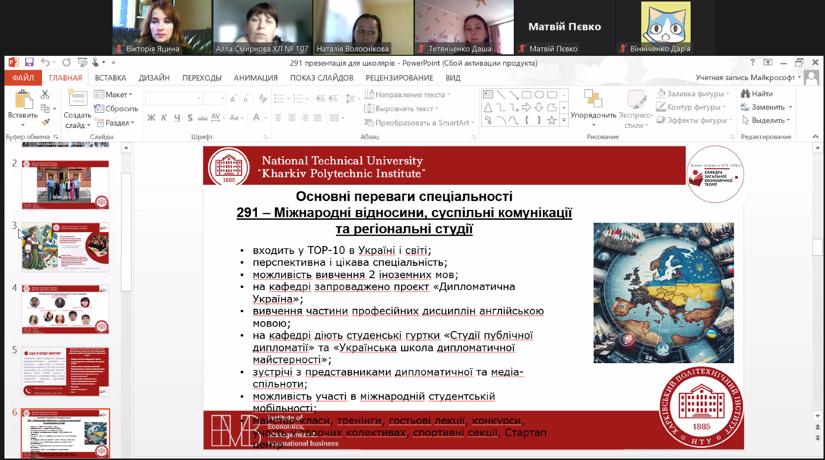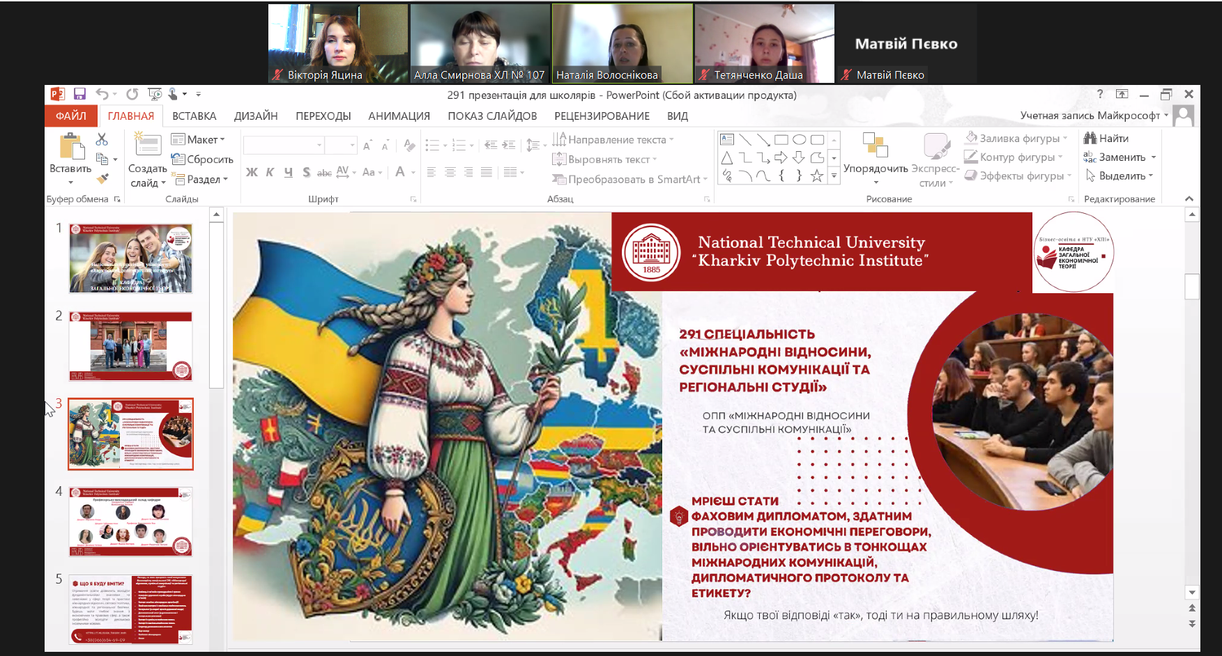 Доцентка кафедри загальної економічної теорії Вікторія Яцина провела профорієнтаційну зустріч із учнями Харківського ліцею № 107. Школярі дізналися про спеціальність 291 – Міжнародні відносини, суспільні комунікації та регіональні студії, яка пропонує широкі можливості для розвитку кар’єри в сучасних умовах.