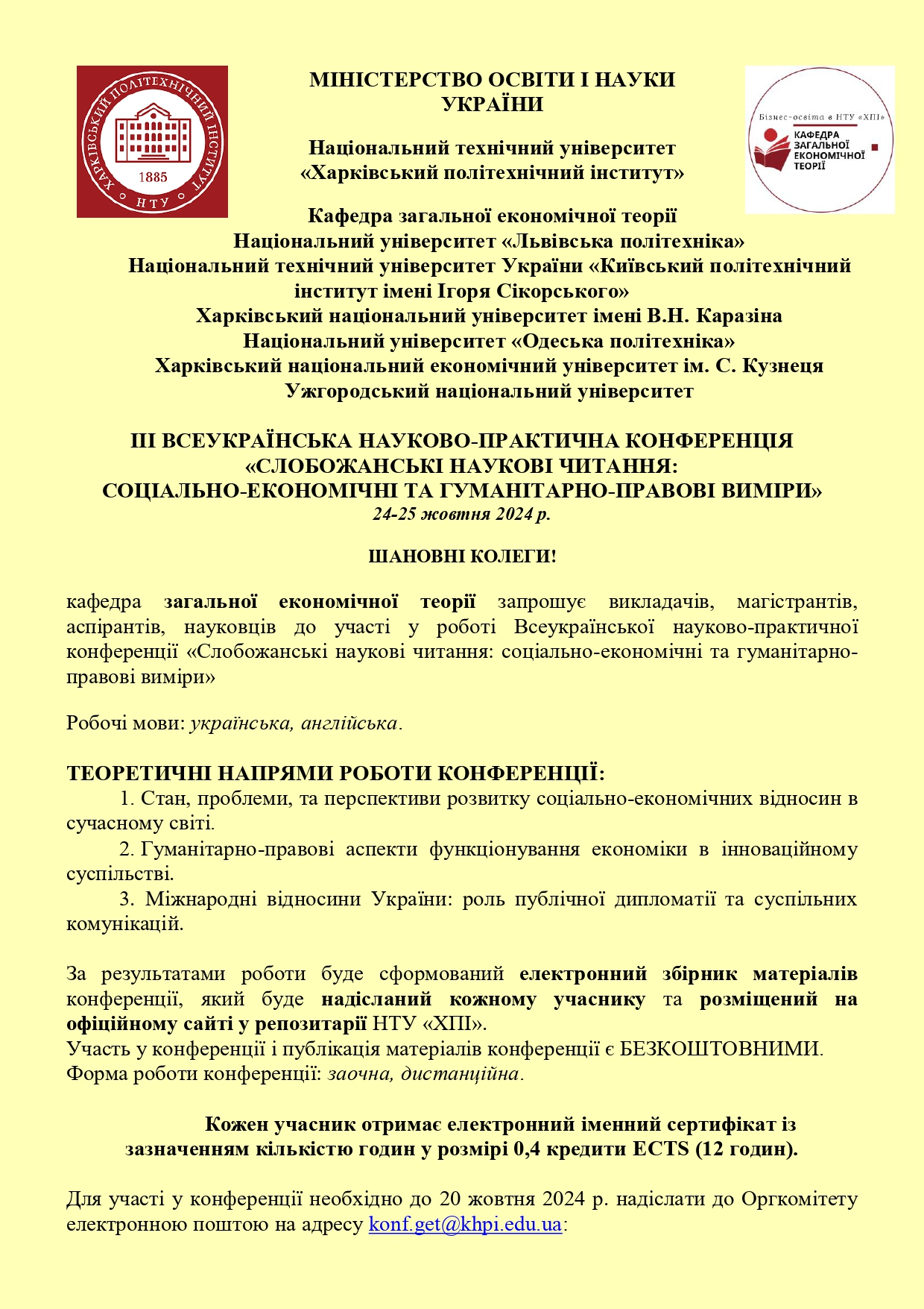 ШАНОВНІ КОЛЕГИ! кафедра загальної економічної теорії запрошує викладачів, магістрантів, аспірантів, науковців до участі у роботі Всеукраїнської науково-практичної конференції «Слобожанські наукові читання: соціально-економічні та гуманітарно-правові виміри»