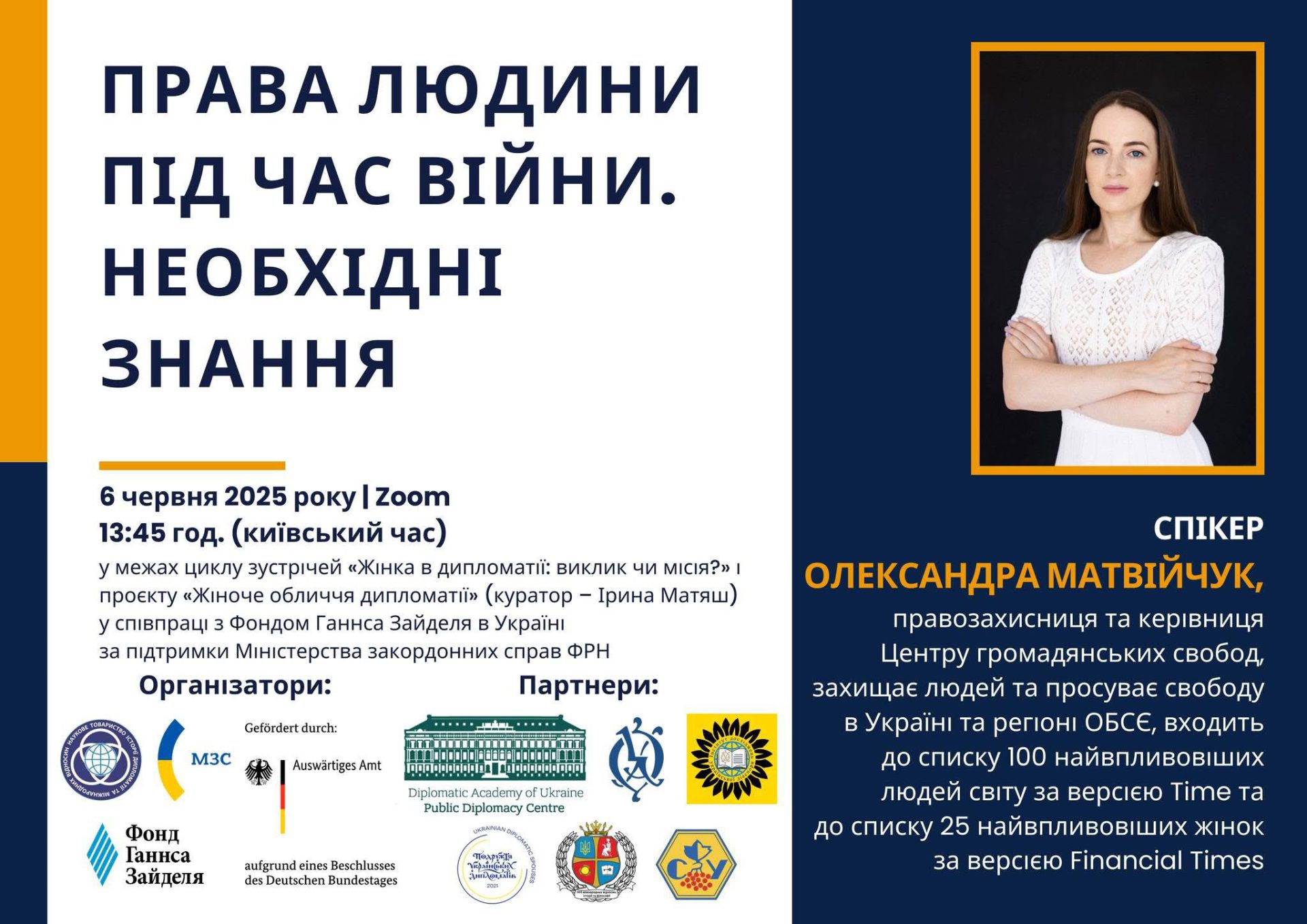 Щиро дякуємо організаторам заходу, а особливо – пані Ірині Матяш, за можливість долучитися до важливого фахового діалогу щодо актуальних викликів у сфері міжнародного права та прав людини. Цінуємо нагоду підвищити рівень професійної обізнаності та долучитися до обговорення тем, які формують майбутнє української дипломатії.