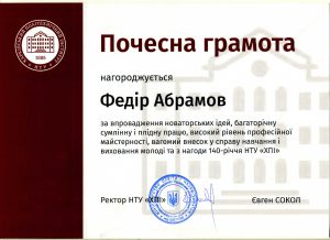 Почесними грамотами від ректора НТУ «ХПІ» Євгена Сокола за впровадження новаторських ідей, багаторічну сумлінну і плідну працю, високий рівень професійної майстерності та вагомий внесок у справу навчання і виховання молоді нагороджені завідувачка кафедри Наталія Волоснікова, доцент Федір Абрамов та доцентка Вікторія Яцина.