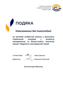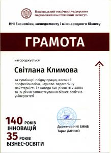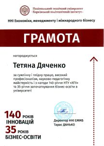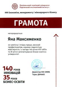 Відзначено грамотами за підписом директора ННІ ЕММБ Тараса Данька за сумлінну і плідну працю, високий професіоналізм, науково-педагогічну майстерність та з нагоди ювілейних дат університету професорку Яну Максименко, доценток Тетяну Деченко та Світлану Климову. Подякою від Української асоціації з розвитку менеджменту та бізнес-освіти за вагомий особистий внесок у діяльність УАРМБО, невтомну працю та відданість викладацькій справі відзначено Яну Максименко.