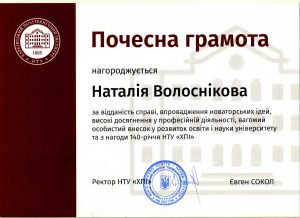 Почесними грамотами від ректора НТУ «ХПІ» Євгена Сокола за впровадження новаторських ідей, багаторічну сумлінну і плідну працю, високий рівень професійної майстерності та вагомий внесок у справу навчання і виховання молоді нагороджені завідувачка кафедри Наталія Волоснікова, доцент Федір Абрамов та доцентка Вікторія Яцина.