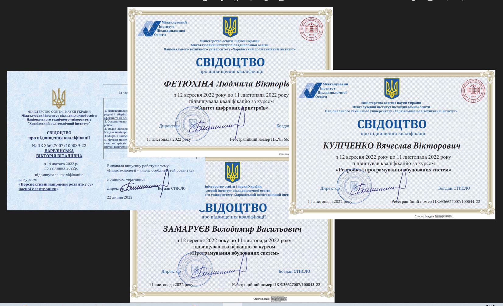 Незважаючи на всі виклики, які рік поспіль змінюють наші комунікаційні можливості, творче мислення і власне бачення майбутнього, все ж викладачі кафедри впевнено рухаються вперед, прагнучі підвищити рівень своєї кваліфікації. В цьому процесі треба відмітити допомогу директора Міжгалузевого інституту післядипломної освіти Національного технічного університету «Харківський політехнічний інститут» Богдана Стисло за здатність швидко реагувати на запити та потреби слухачів, рекомендувати проходження індивідуальних курсів, надаючи якісні знання, що використовуються в професійній діяльності викладачів. Заняття проводились в дистанційній формі. Всього в МІПО підвищили кваліфікацію наступні викладачі: Вікторія Варв’янська за темою «Перспективні напрямки розвитку сучасної електроніки», Володимир Замаруєв – «Програмування вбудованих систем», Вячеслав Куліченко – «Розробка і програмування вбудованих систем», Людмила Фетюхіна – «Синтез цифрових пристроїв». Всі вони одержали відповідні сертифікати. Великий об’єм інформації, що було отримано, буде використано при модифікації лекційних курсів, лабораторних та практичних робіт, забезпечуючи їх відповідність сучасним тенденціям розвитку електроніки.