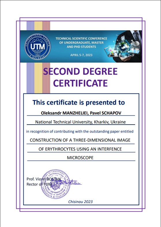 Так, наприклад, продовжуючи дослідження в галузі біомедичного приладобудування, свій науковий творчій доробок “Construction of the three dimensional image of erythrocytes using an interference microscope“ доповів студент групи Е-619б Манжелєй Олександр на конференції “Technical Scientific Conference invites undergraduate, master and PhD”, що відбулася 5-7 квітня у Технічному університеті Молдови, м. Кишинів.