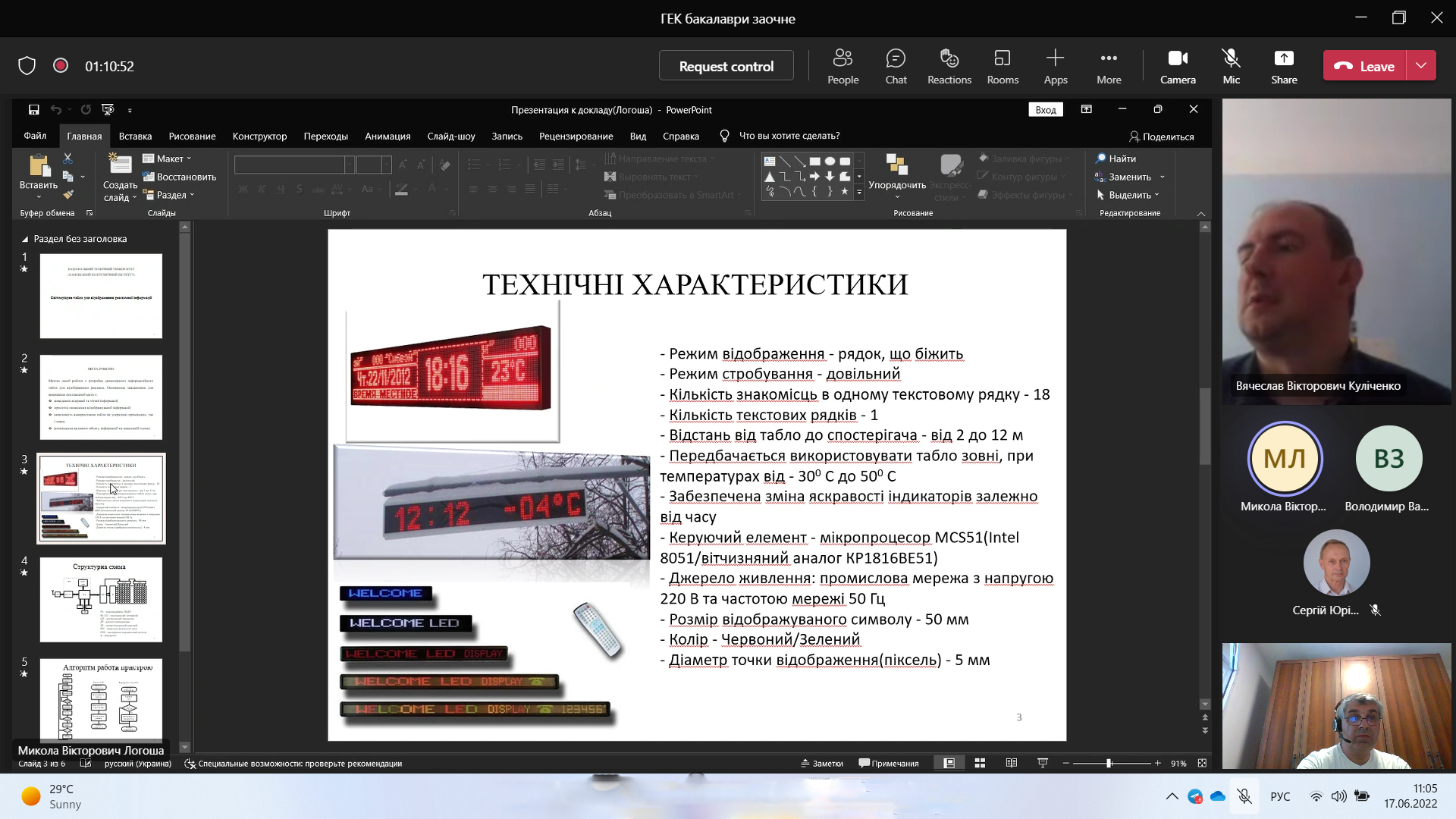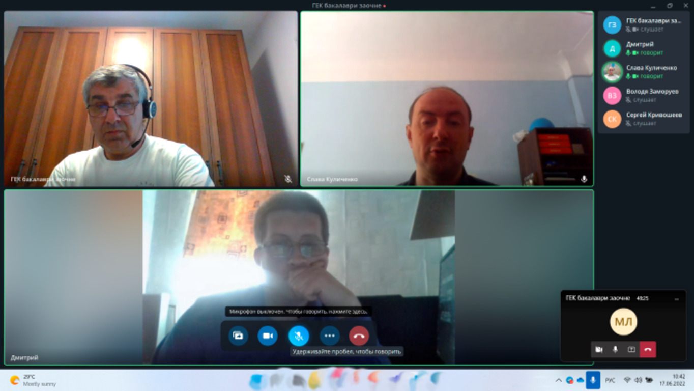 Сьогодні, 17 червня 2022 року, на кафедрі Промислова і біомедична електроніка відбувся захист кваліфікаційних робіт бакалаврів заочної форми навчання. Попри складний час, всі студенти зробили все можливе, щоб гідно підготуватися до захисту. Різні можливості зв’язку вимагали застосування не тільки корпоративної мережі, а і проведення захисту за допомогою телеграм месенджера, і навіть в асинхронному режимі.