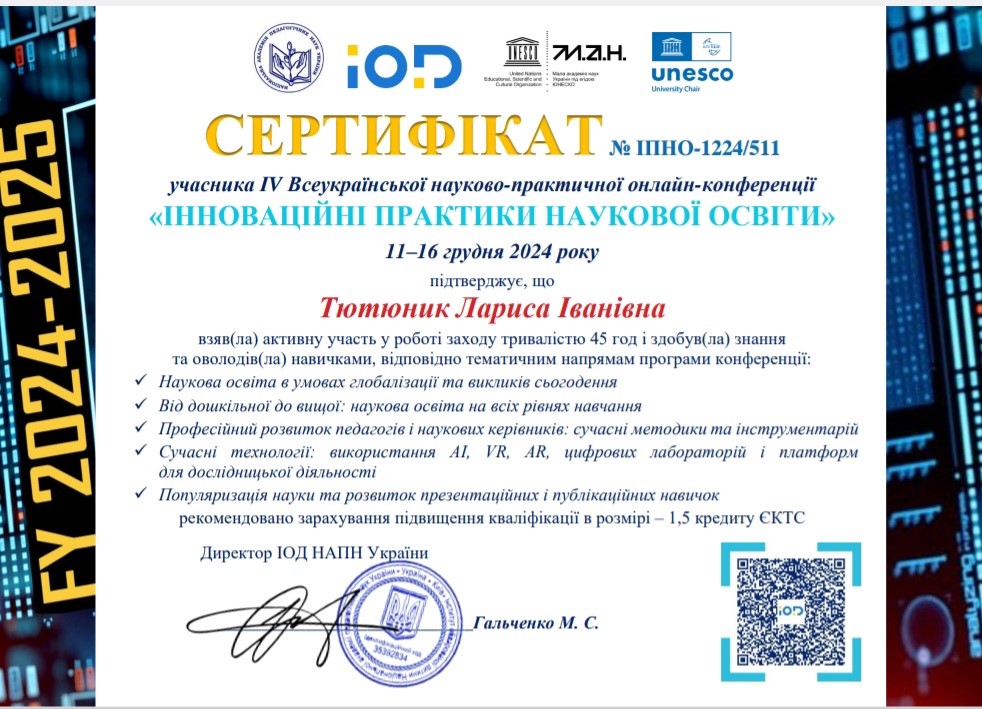 «Інноваційні практики наукової освіти» (11-12-2024), організаторами якої виступили: Національна академія педагогічних наук України, Інститут