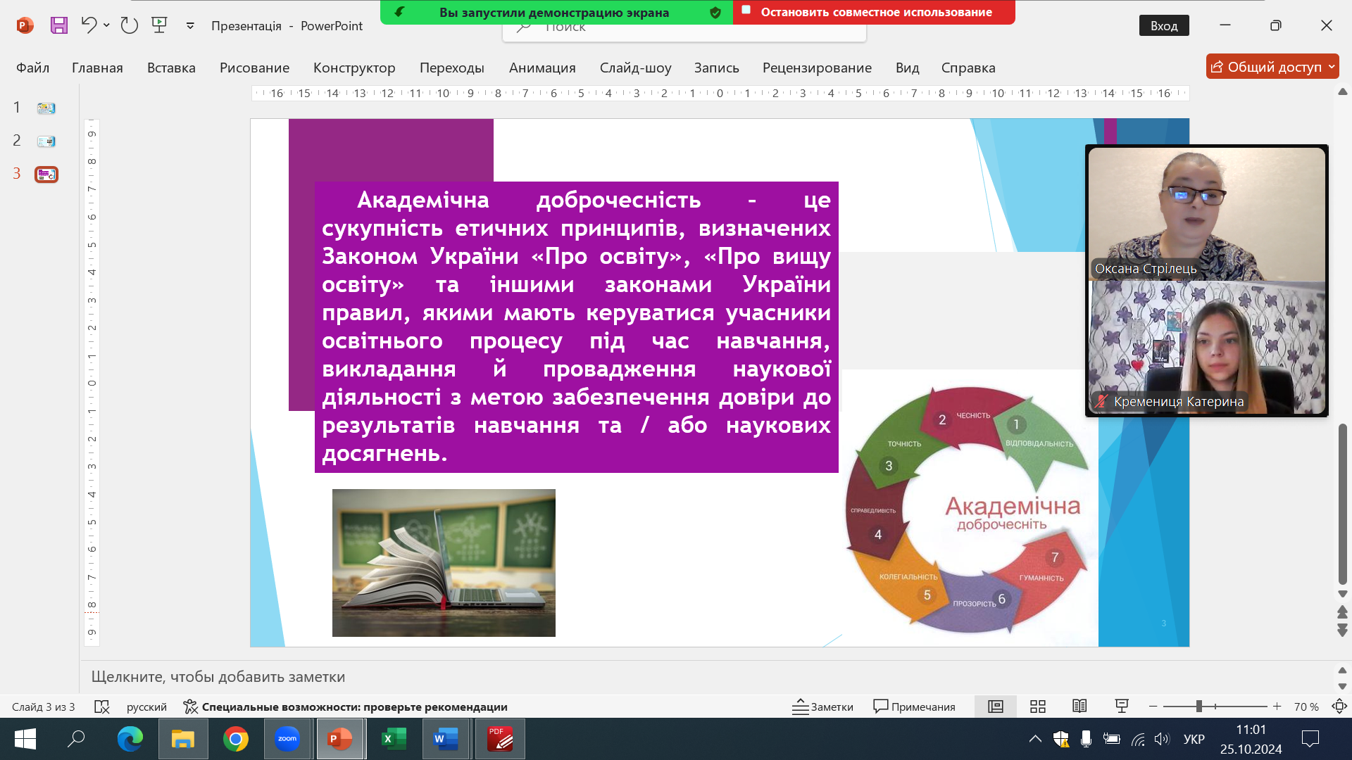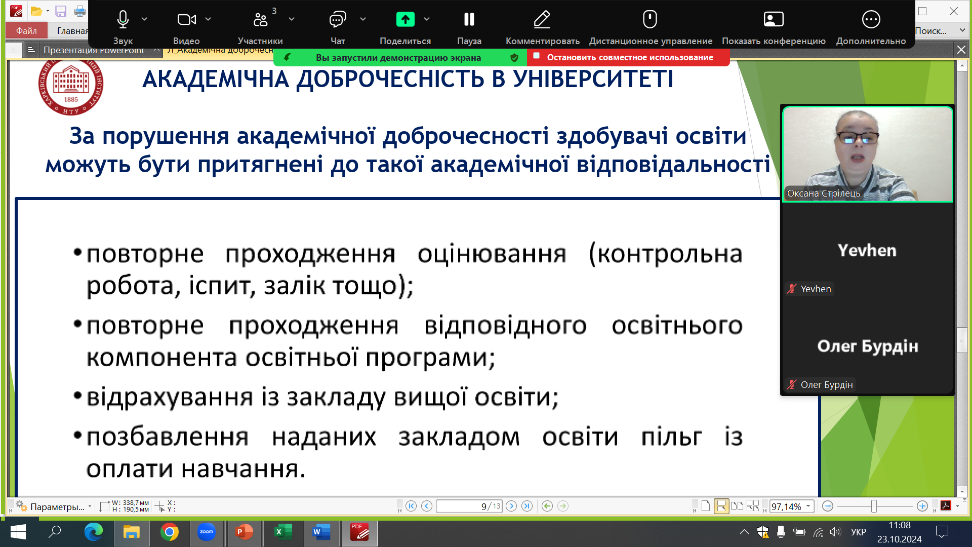 23 жовтня 2024 року гарант ОП «Фармація, промислова фармація», завідувач кафедри Стрілець О.П. провела бесіду зі здобувачами вищої освіти груп ХТ-222, ХТ-М724 на тему «Академічна доброчесність – запорука якісної освіти».