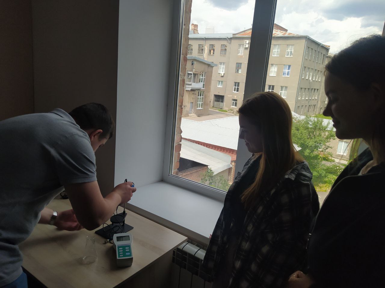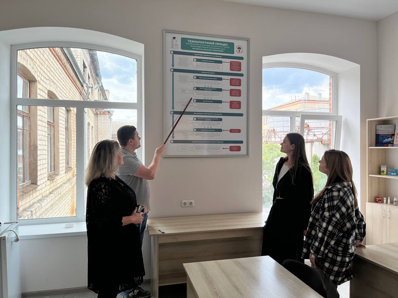 Meeting with graduates of the first bachelor’s and second master’s level in the updated laboratory of the Department of Organic Synthesis and Pharmaceutical Technologies, Discussion of changes to the educational professional program “Technology of organic substances, food additives and components of cosmetic products”. In the photo, graduates of 2024 Roman Dzyoh – Process Engineering Engineer of the RLS, – JSC “Farmak” and Maksym Chypizhyn – Master of the SLZ Shop No. 1, LLC “KhFP” Health of the People”. Graduates of 2025 Iryna Simonenko and Kristina Lytvynenko also participated in the discussion.