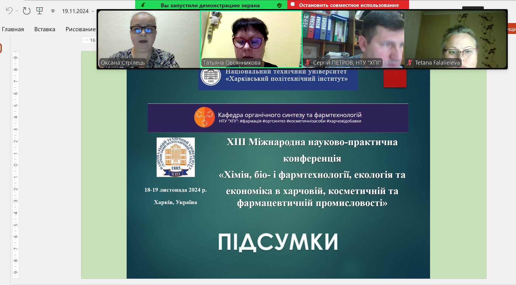 19.11.2024 було проведено засідання кафедри ОСФТ щодо підсумків проведеної XIІ Міжнародної наукової конференції «ХІМІЯ, БІО- І ФАРМТЕХНОЛОГІЇ, ЕКОЛОГІЯ ТА ЕКОНОМІКА В ХАРЧОВІЙ, КОСМЕТИЧНІЙ ТА ФАРМАЦЕВТИЧНІЙ ПРОМИСЛОВОСТІ» (18-19 листопада 2024 р.)