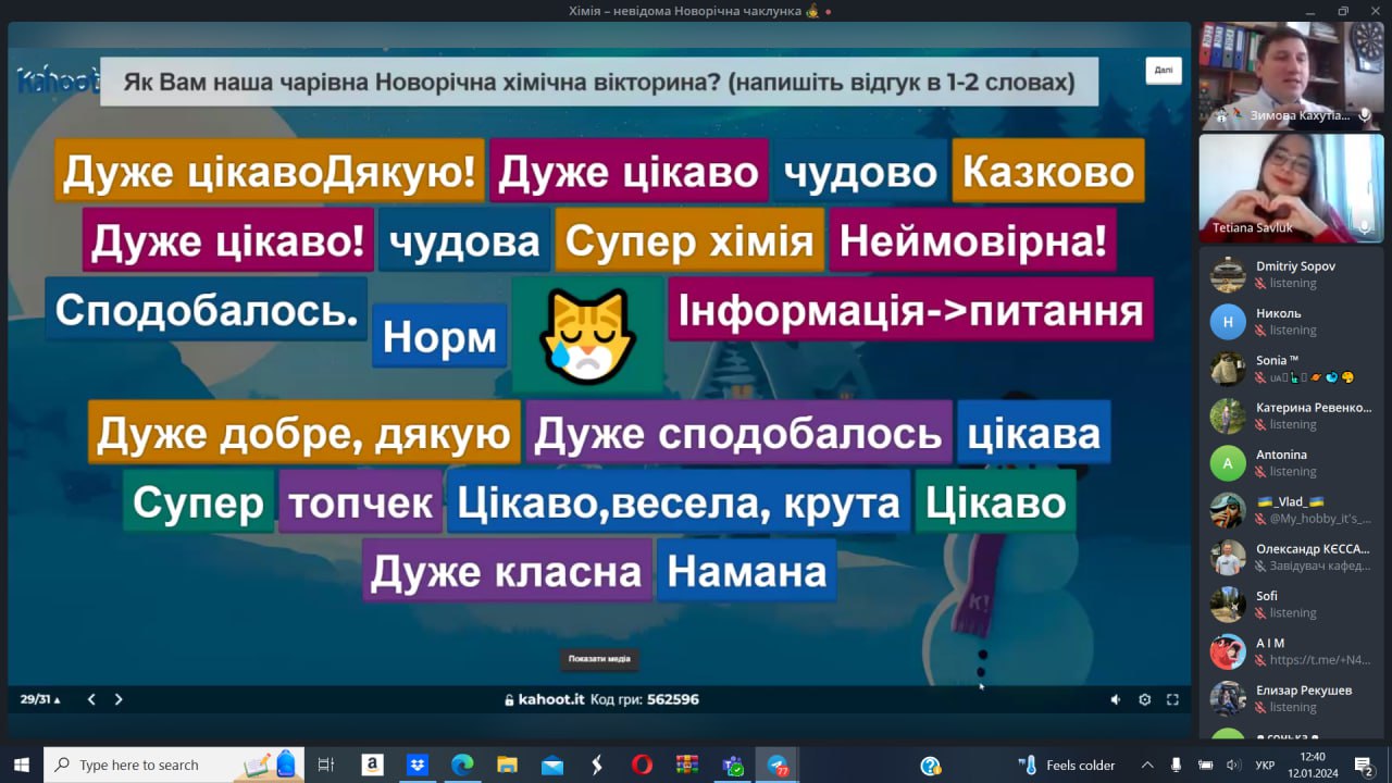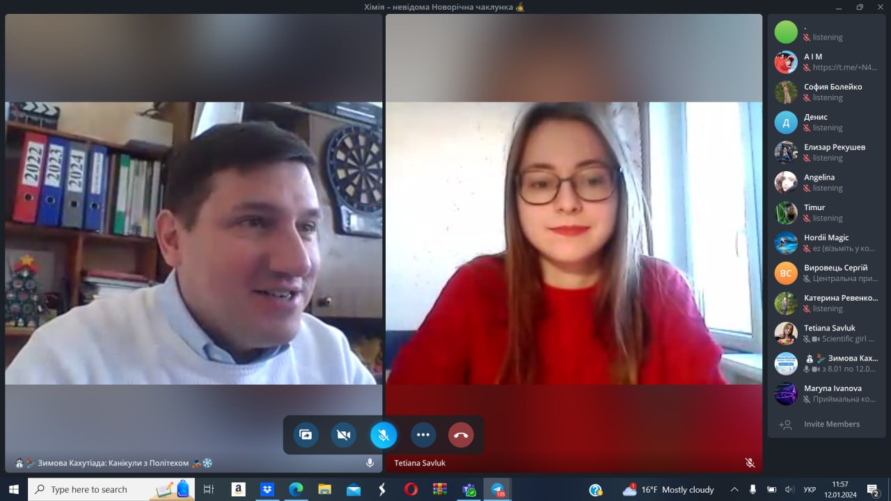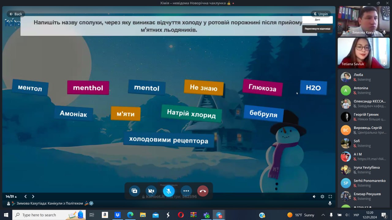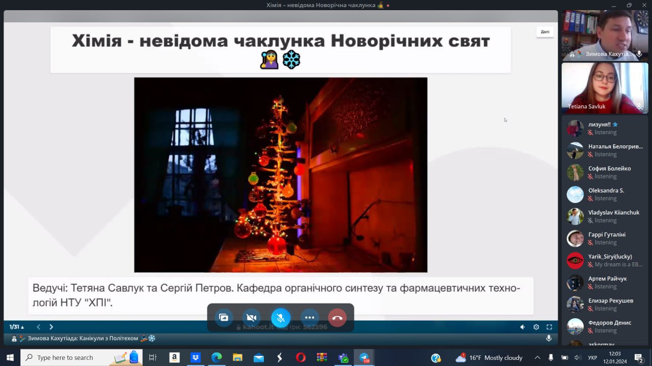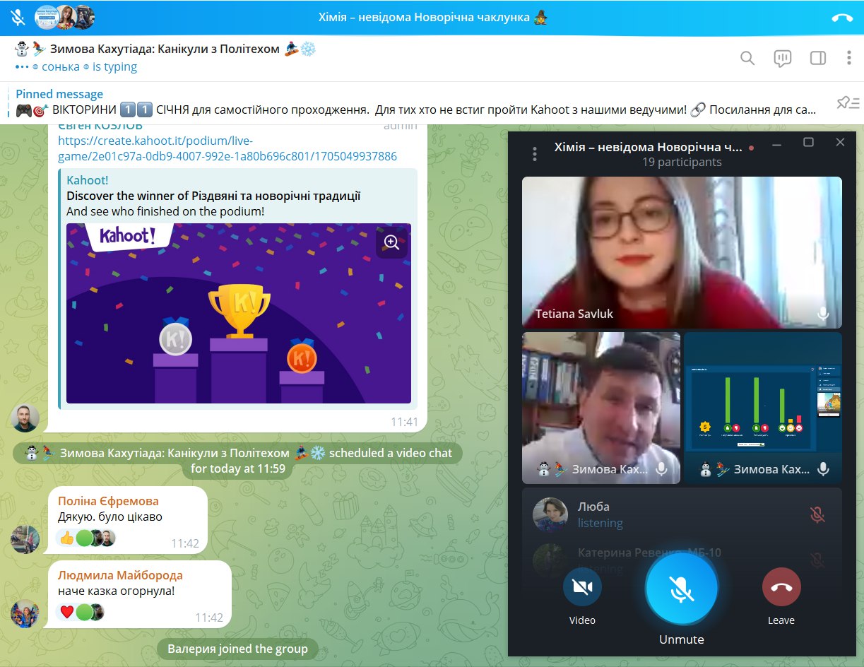 12 січня 2024 року студентка та активістка стдентентського наукового товариства кафедри Тетяна Савлук та професор кафедри Сергій Петров провели науково-популяризаційну Kahoot-вікторину в рамках Зимової Кахутіади: Канікули з Політехом 2024. Метою заходу стала популяризація хімії, як науки серед учнів закладів сереньої освіти.