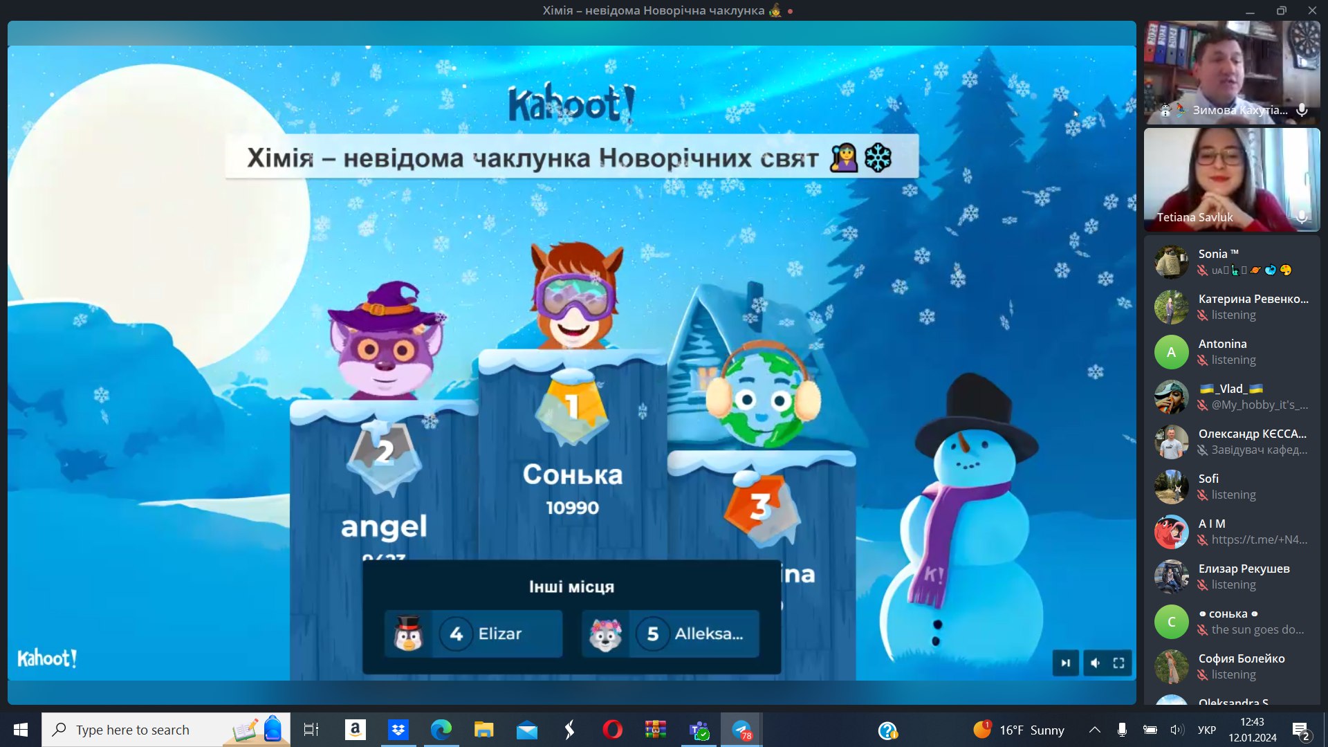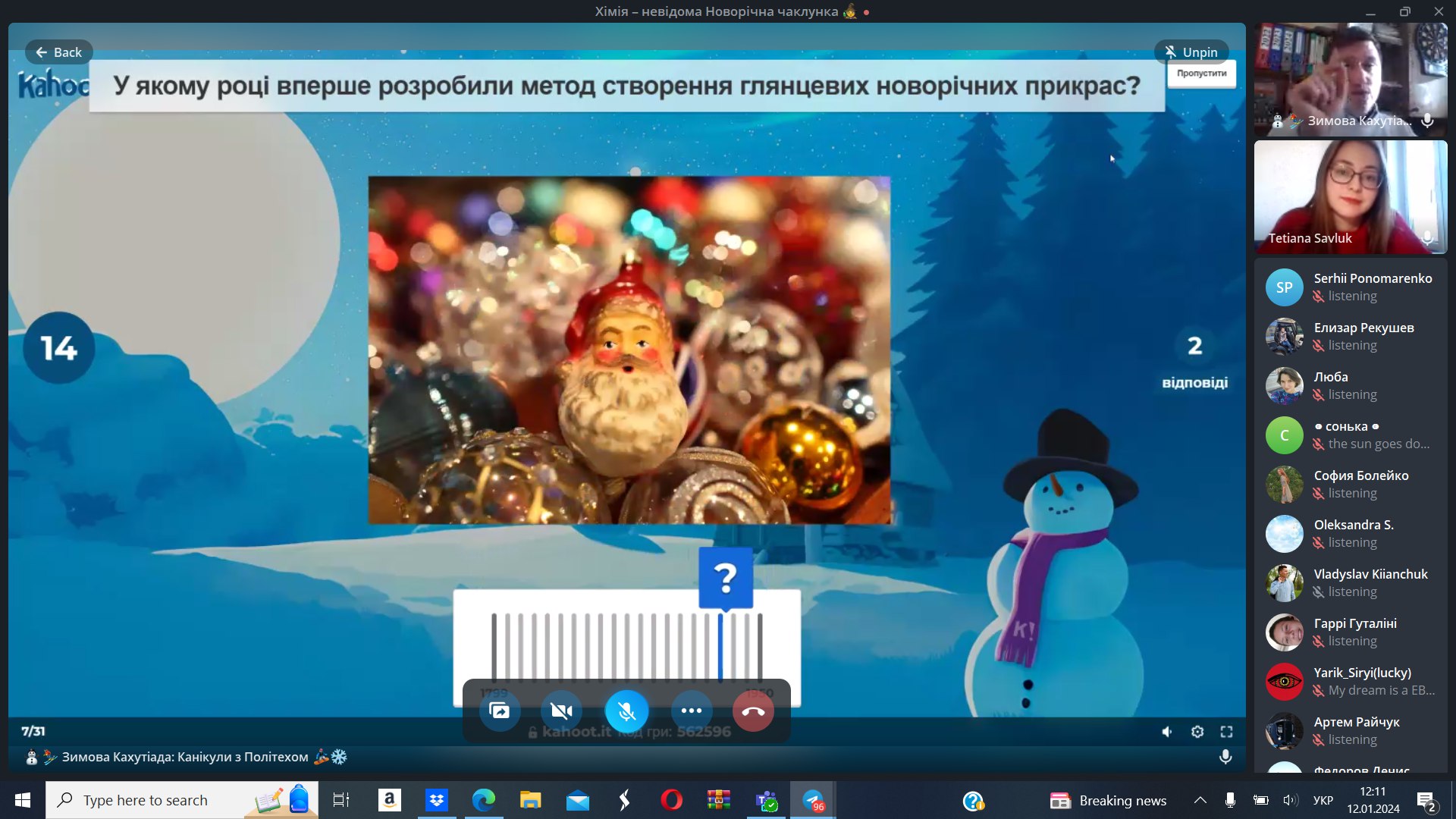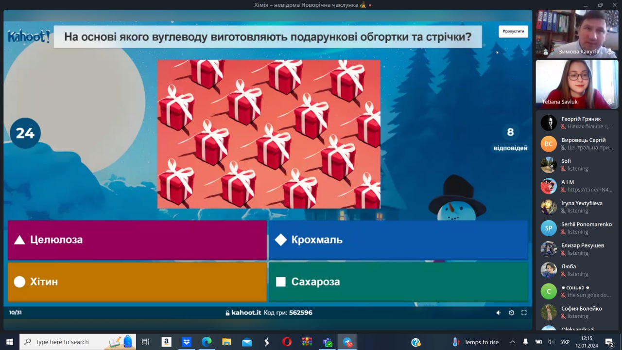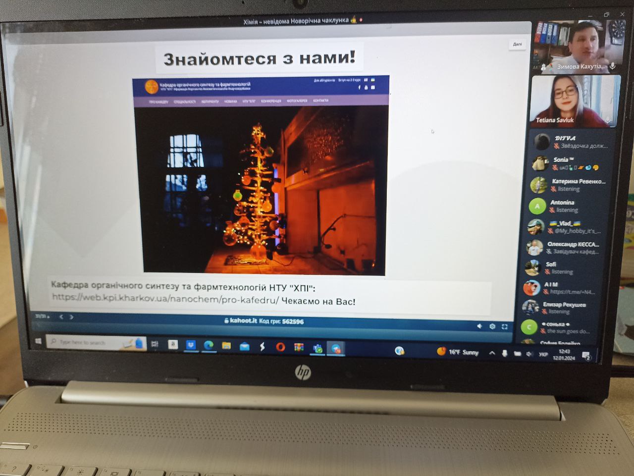 12 січня 2024 року студентка та активістка стдентентського наукового товариства кафедри Тетяна Савлук та професор кафедри Сергій Петров провели науково-популяризаційну Kahoot-вікторину в рамках Зимової Кахутіади: Канікули з Політехом 2024. Метою заходу стала популяризація хімії, як науки серед учнів закладів сереньої освіти.