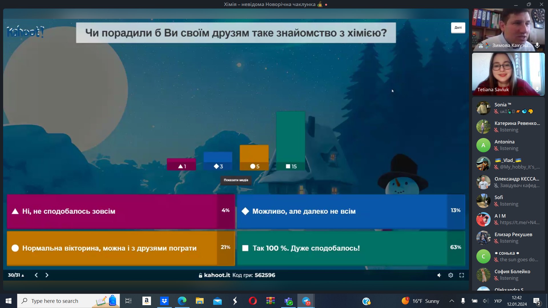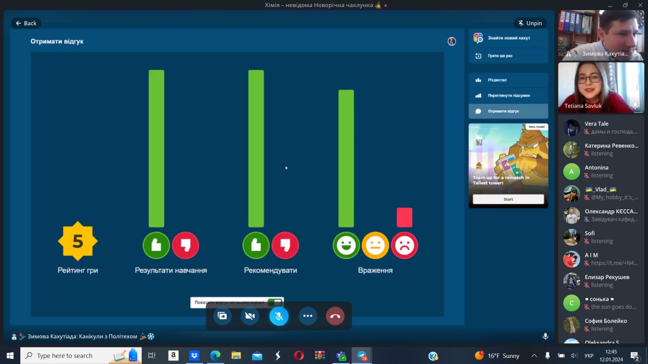 За результатом проведення вікторини під назвою “Хімія – невідома чаклунка Новорічних свят” було отримано позитивний відгук від учасників, які відзначили вікорину позитивними відгуками та високими оцінками, а також та за результатом опитування більшіть учасників наголосила, що готова рекомендувати своїм друзям знайомство із хімією в такому форматі (ці результати Ви можете побачити на наступних зображеннях):