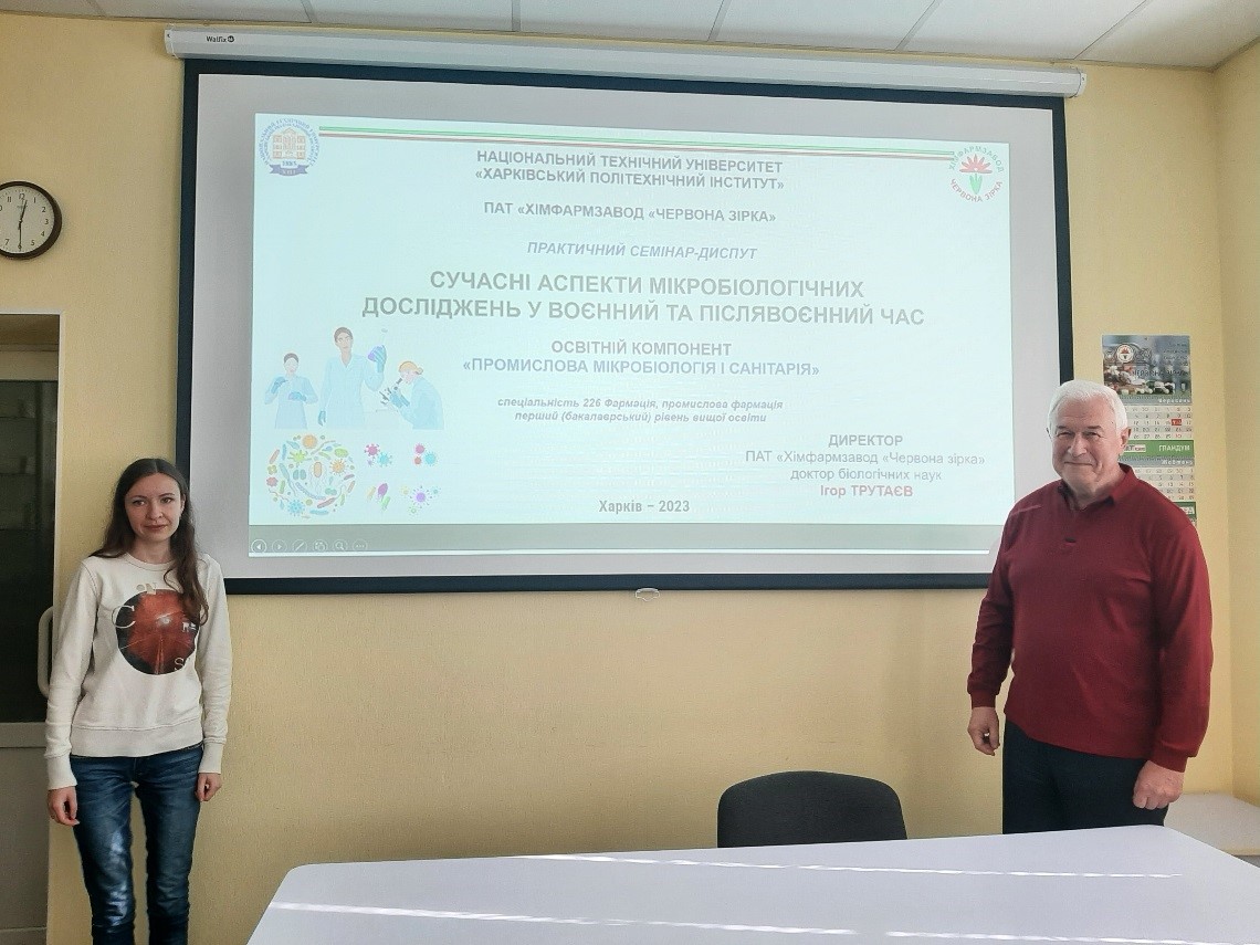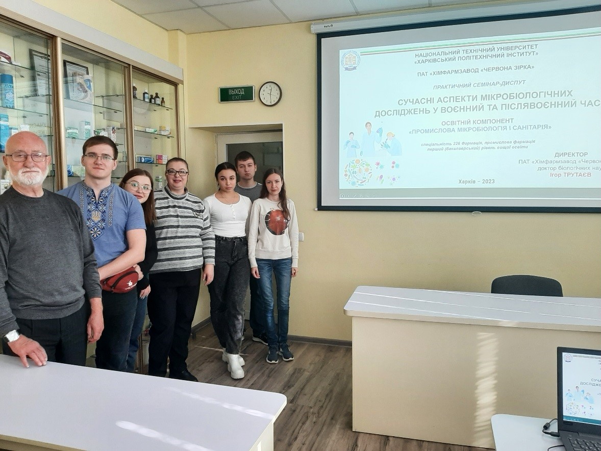 28 жовтня 2023 року директор ПАТ ХФЗ «Червона зірка», доктор біологічних наук Ігор Вікторович ТРУТАЄВ провів практичний семінар-диспут для здобувачів вищої світи спеціальності 226 Фармація, промислова фармація першого (бакалаврського) рівня вищої освіти «СУЧАСНІ АСПЕКТИ МІКРОБІОЛОГІЧНИХ ДОСЛІДЖЕНЬ У ВОЄННИЙ ТА ПІСЛЯВОЄННИЙ ЧАС» в рамках освітнього компонента «Промислова мікробіологія і санітарія».
