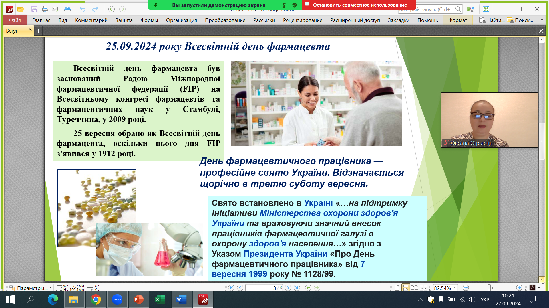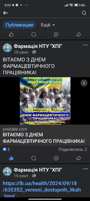 У вересні 2024 р. викладачі кафедри органічного синтезу та фармацевтичних технологій НТУ «ХПІ» професори Стрілець О.П. і Стрельников Л.С., доцент Спиридонов С.В. привітали здобувачів вищої освіти спеціальності 226 Фармація, промислова фармація (бакалаврів, магістрів) з професійними святами – Днем фармацевтичного працівника України (21 вересня 2024р.) і Всесвітнім днем фармацевти (25 вересня 2024р.).