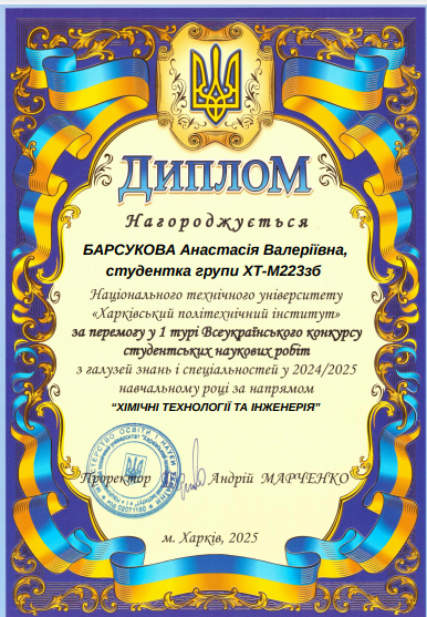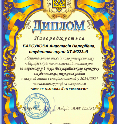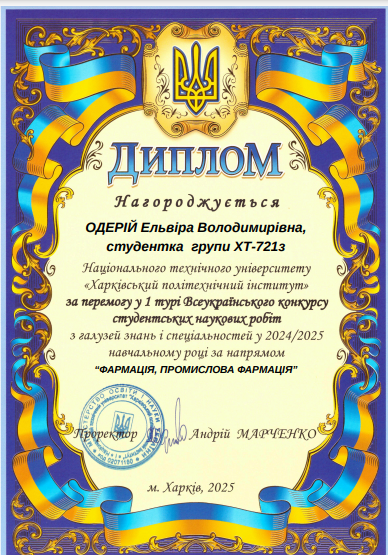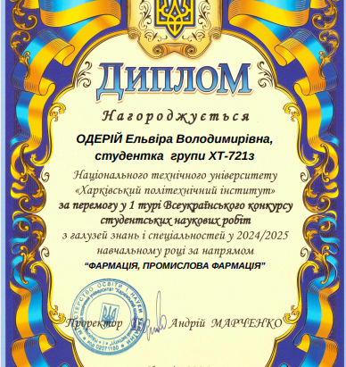 Студенти кафедри органічного синтезу та фармацевтичних технологій прийняли участь у І турі Всеукраїнського конкурсу студентських наукових робіт з галузей знань та спеціальностей у 2024/2025 навчальному році. Переможцями стали: за напрямом «Хімічні технології та інженерія» ‒ студентка групи ХТ-М223зб Барсукова Анастасія Валеріївна з роботою «Розробка рецептури та технології сироватки пре-шампунь», виконану під керівництвом доцента кафедри ОСФТ Овсянніковой Т.О. та за напрямом «Фармація, промислова фармація» ‒ студентка групи ХТ-721з Одерій Ельвіра Володимирівна з роботою «Вибір допоміжних речовин та розробка технології отримання гранул венотропної дії», виконану під керівництвом доцента кафедри ОСФТ Спиридонова С.В.