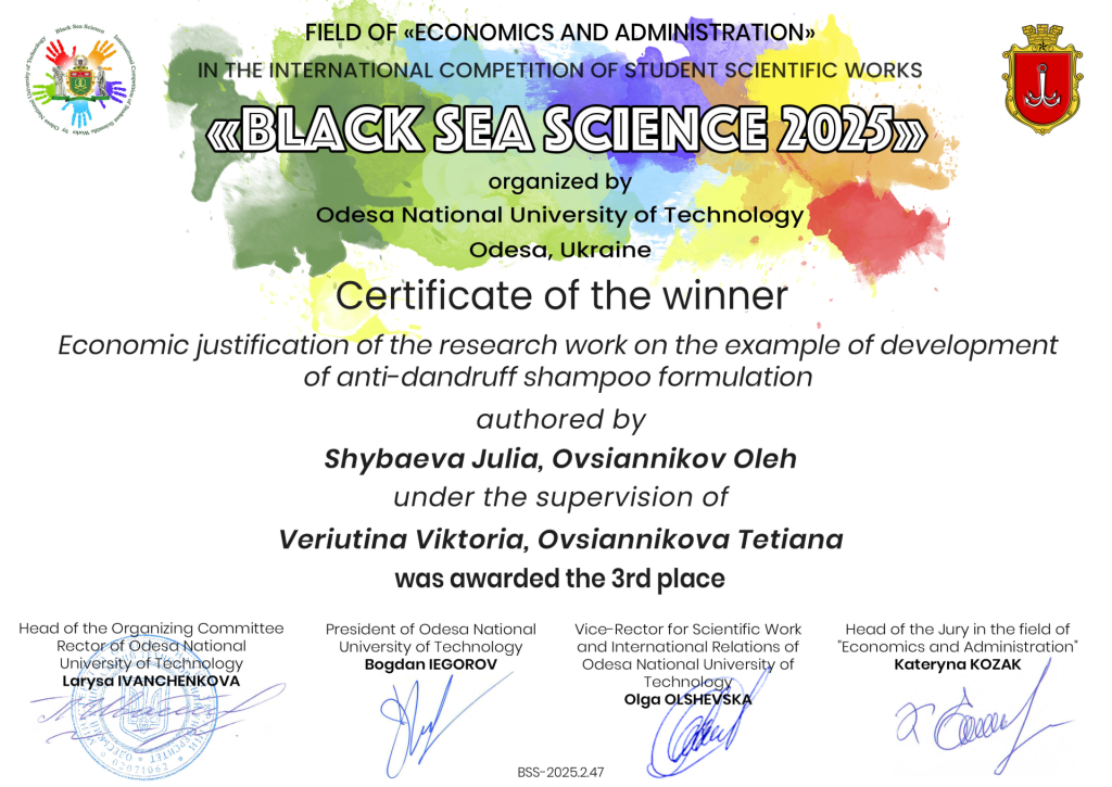 Студентка групи ХТ-М223зб кафедри органічного синтезу та фармацевтичних технологій Шибаєва Юлія Віталіївна спільно зі студентом кафедри економіки бізнесу і міжнародних економічних відносин прийняла участь у Міжнародному конкурсі студентських наукових робіт «Black Sea Science 2025». На перший етап конкурсу було прийнято 353 роботи з українських та закордонних закладів, у тому числі з університетів таких країн як: Індія, Іспанія, Німеччина, Австрія, Швеція, Чехія, Алжир, Польща, Болгарія, Молдова, Казахстан. Дослідження студентки кафедри ОСФТ Шибаєвої Юлії стали основою роботи на тему «Economic justification of the research work on the example of development of anti-dandruff shampoo formulation», яка здобула ІІІ місце в другому турі конкурсу. Керівник ‒ доцент кафедри ОСФТ Овсяннікова Т.О.