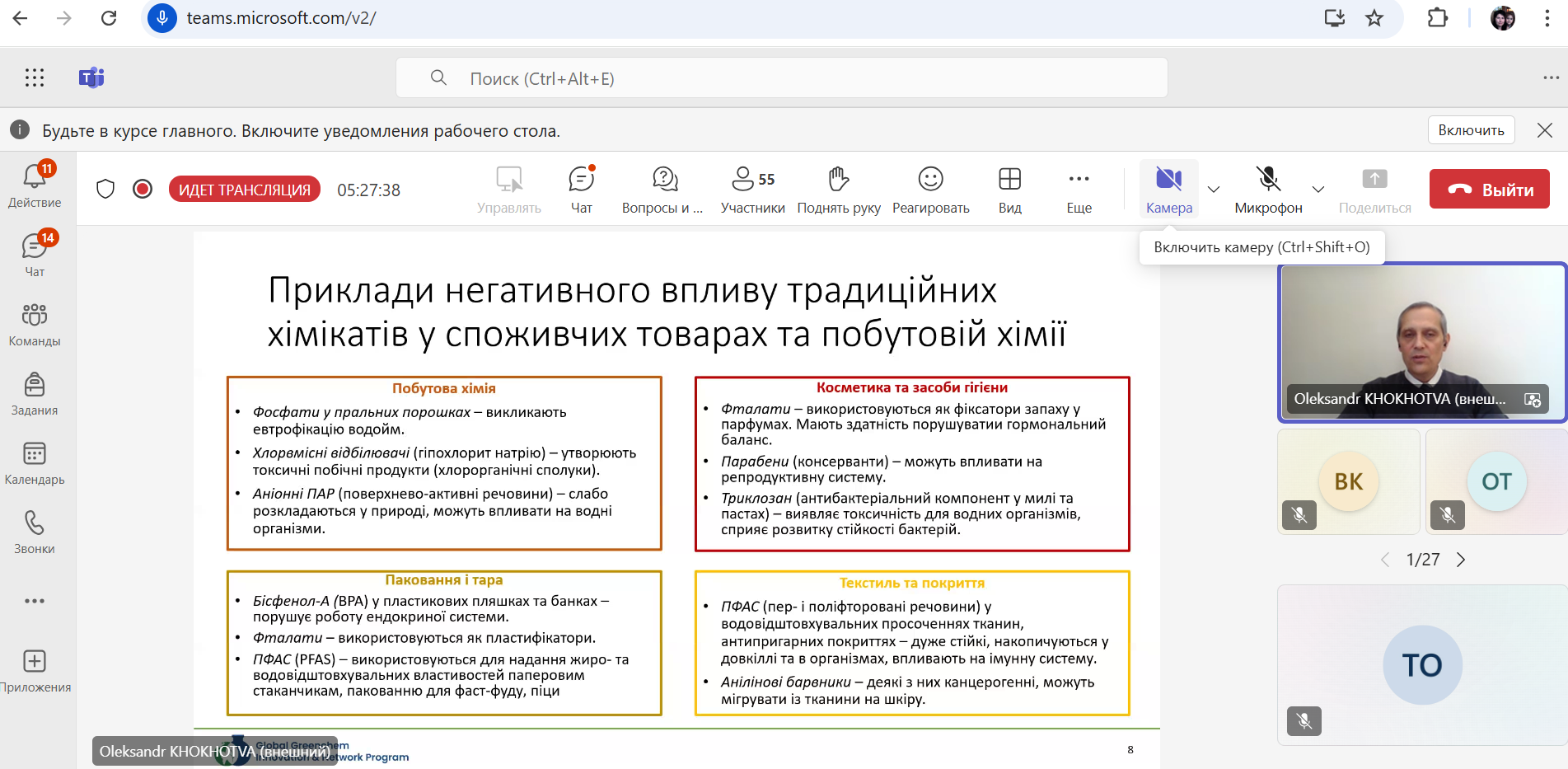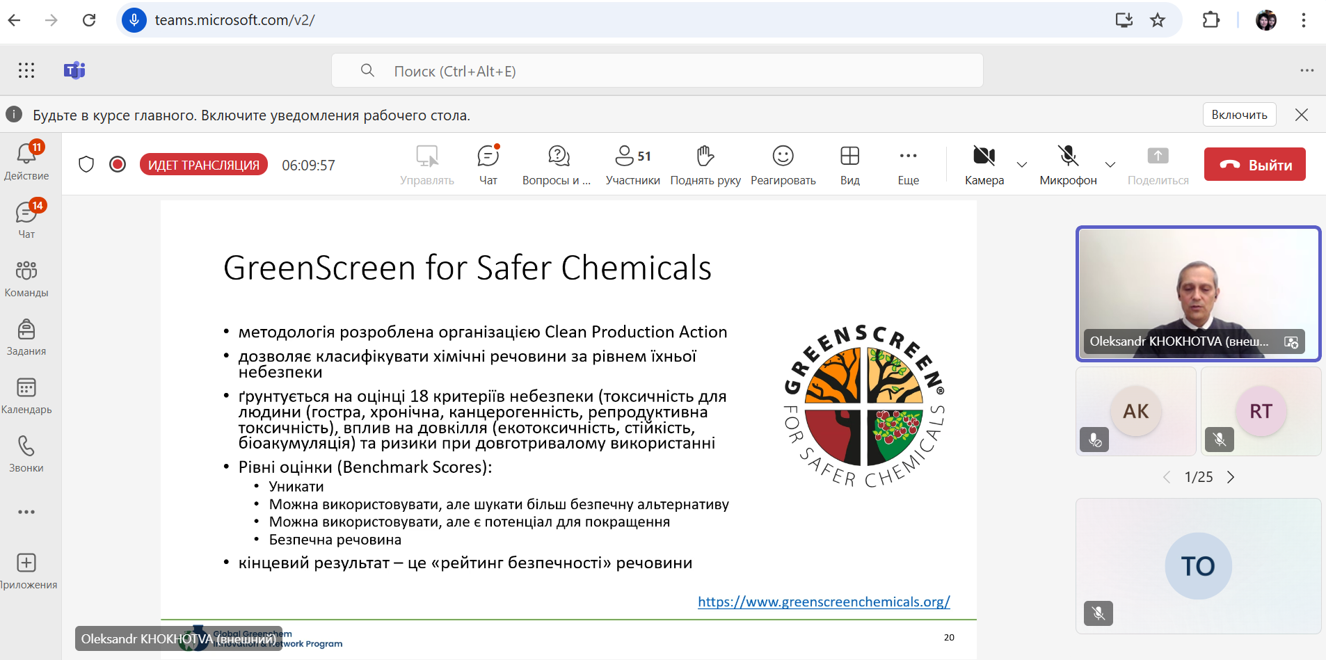 1 жовтня 2025 року викладачі доцент Фалалєєва Т.В., доцент Овсяннікова Т.О. та здобувачі кафедри органічного синтезу та фармацевтичних технологій спеціальності «Технології органічних речовин, харчових добавок та косметичних засобів» (група ХТ-223б) долучилися до вебінару «Безпечні хімікати для споживчих товарів: від принципів до практики».
