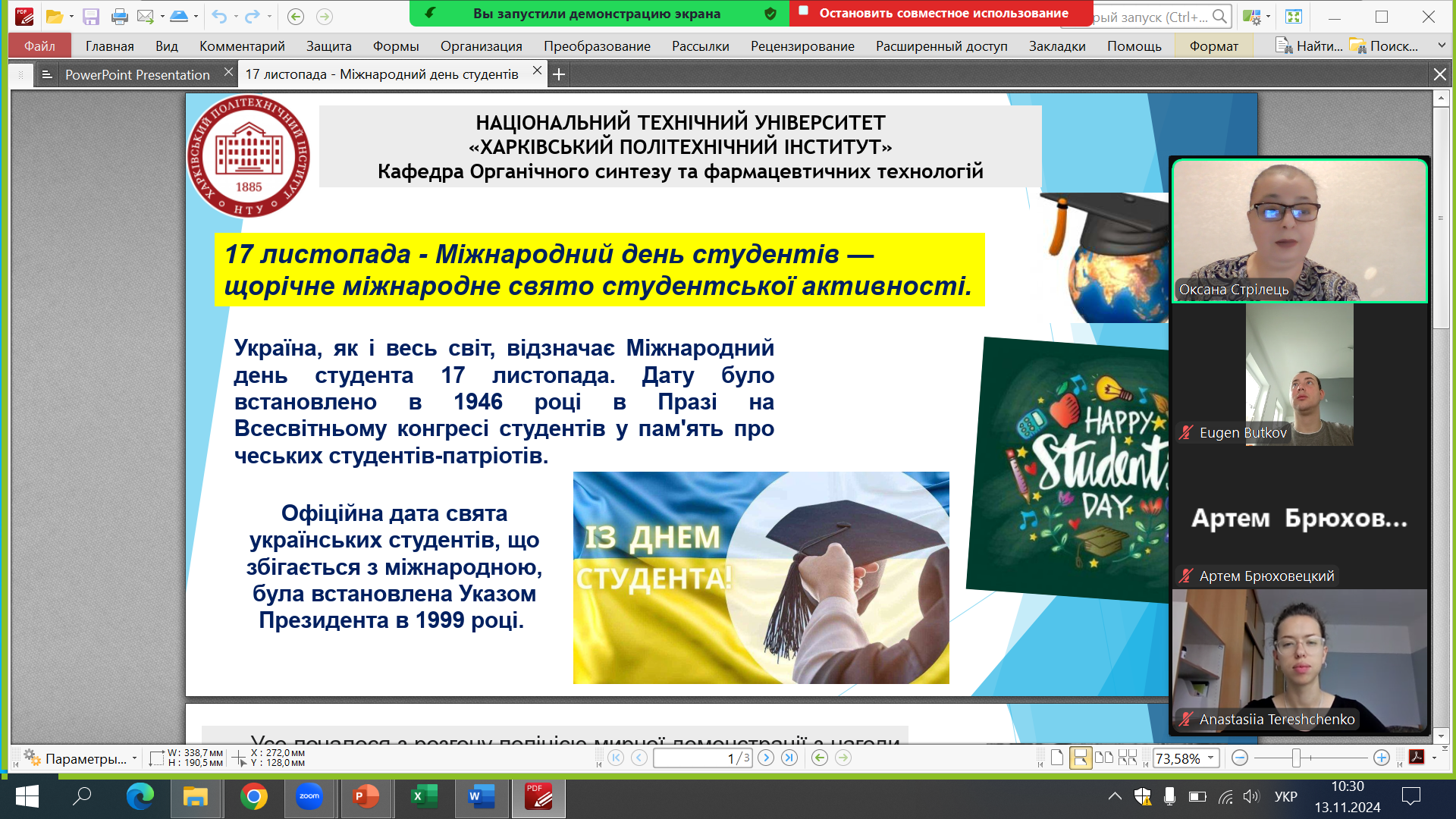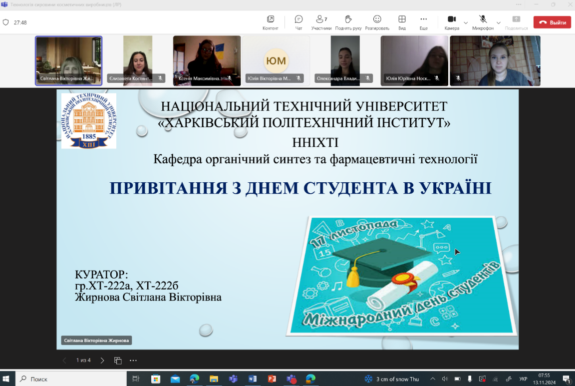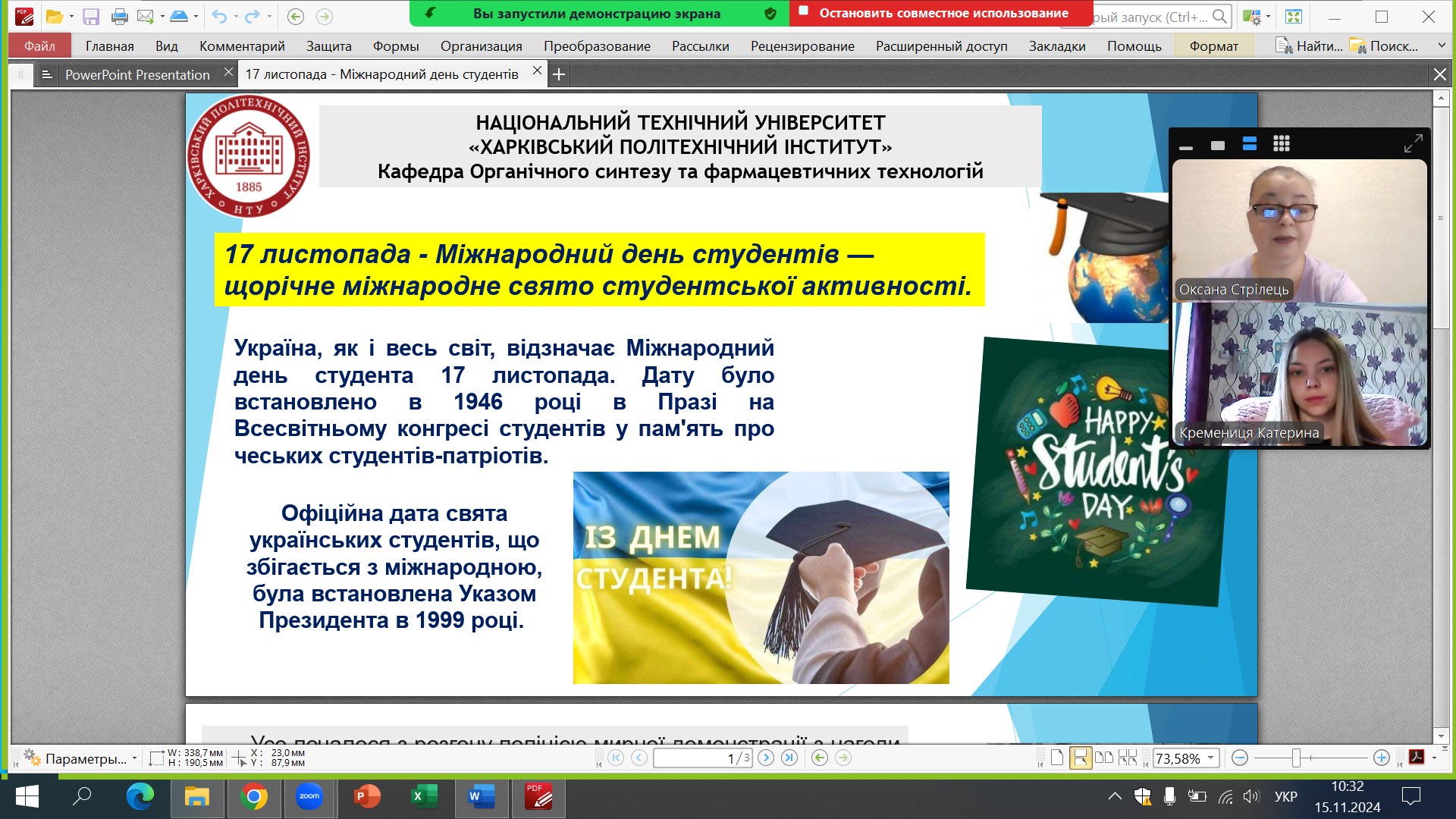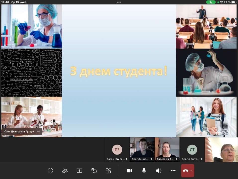 Напередодні Міжнародного дня студента – 17 листопада завідувач кафедри органічного синтезу та фармацевтичних технологій Стрілець О.П., викладачі, куратори кафедри – професори Стрельников Л.С., Петров С.О., доценти Овсяннікова Т.О., Савченко Л.Г., Тимофеєв С.В., Фалалєєва Т.В., Спиридонов С.В., старший викладач Жирнова С.В. привітали всіх здобувачів кафедри спеціальностей 226 Фармація, промислова фармація, 161 Хімічні технології та інженерія з цим Святом.