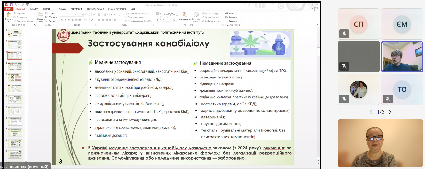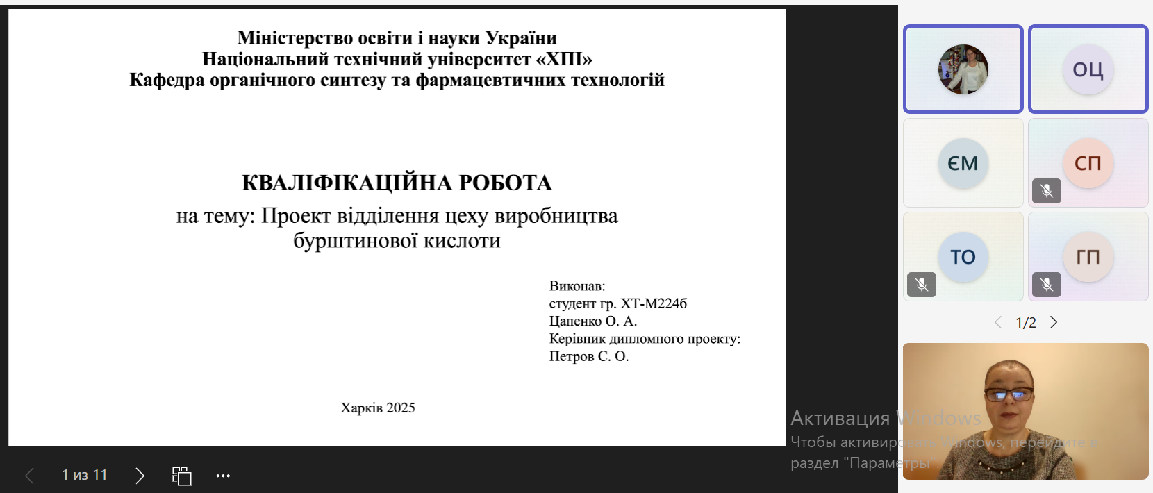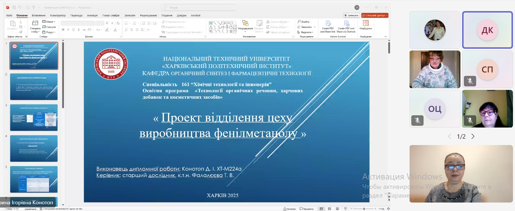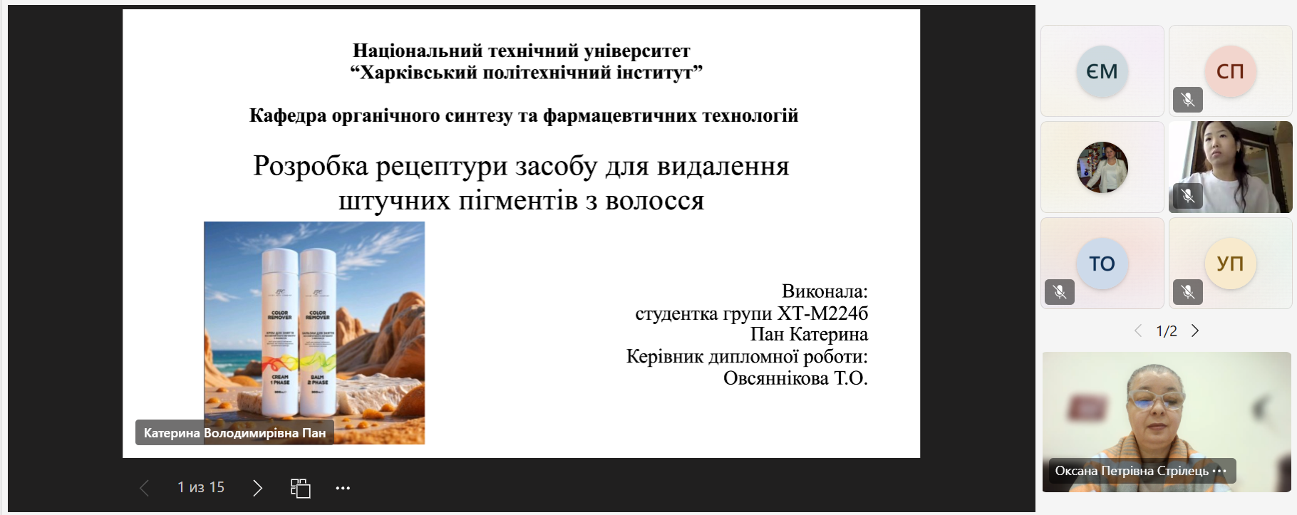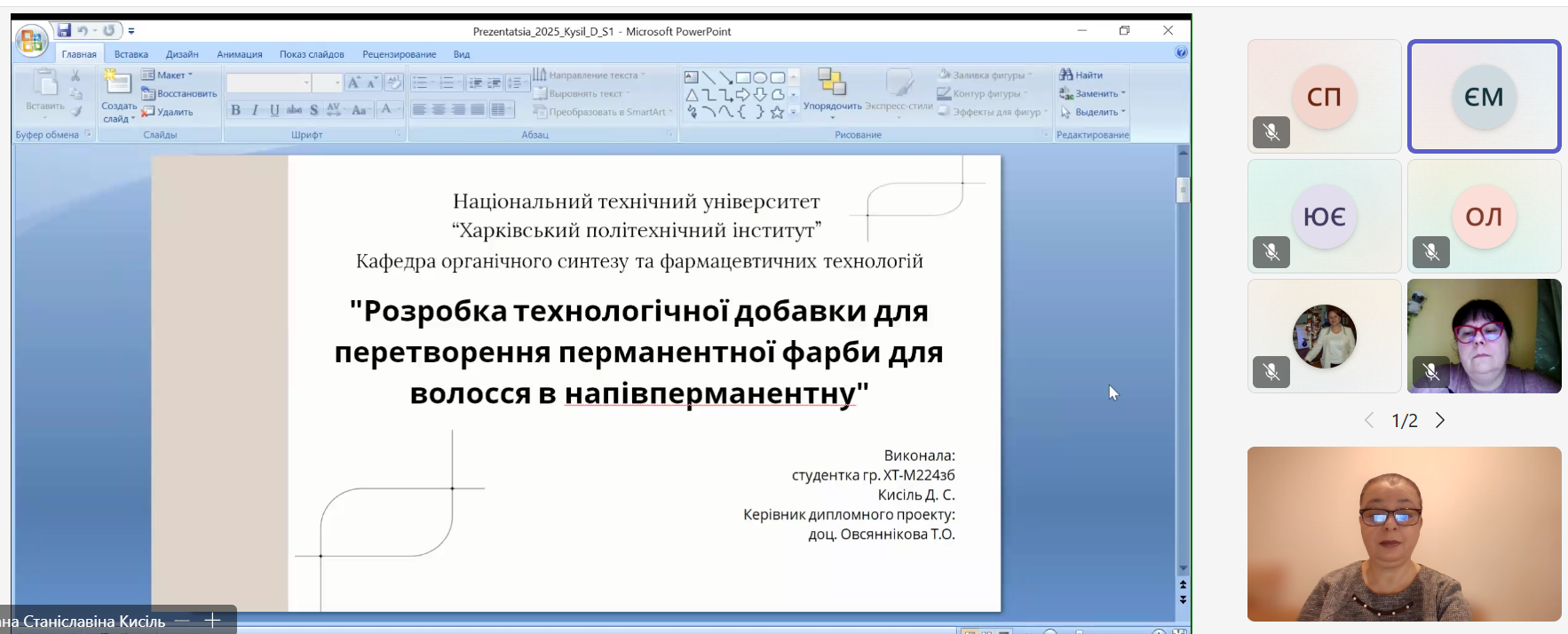 16-18 грудня 2025 року на кафедрі органічного синтезу та фармацевтичних технологій відбулися захисти магістерських кваліфікаційних робіт здобувачами вищої освіти спеціальності 161 «Хімічні технології та інженерія» освітньої програми «Технології органічних речовин, харчових добавок та косметичних засобів» (другий магістерський рівень). Державна екзаменаційна комісія у складі д.т.н., проф. Мірошниченко Д.В., к.т.н., доц. Фалалєєвой Т.В., к.т.н., доц. Овсяннікової Т.О., к.т.н., проф. Петрова С.О. та присутня на захисті д.фарм.н., проф., завідувачка кафедри Стрілець О.П. високо оцінили подані роботи. 15 здобувачів денної та заочної форм навчання успішно захистили свої проекти та отримали кваліфікацію «Магістр».