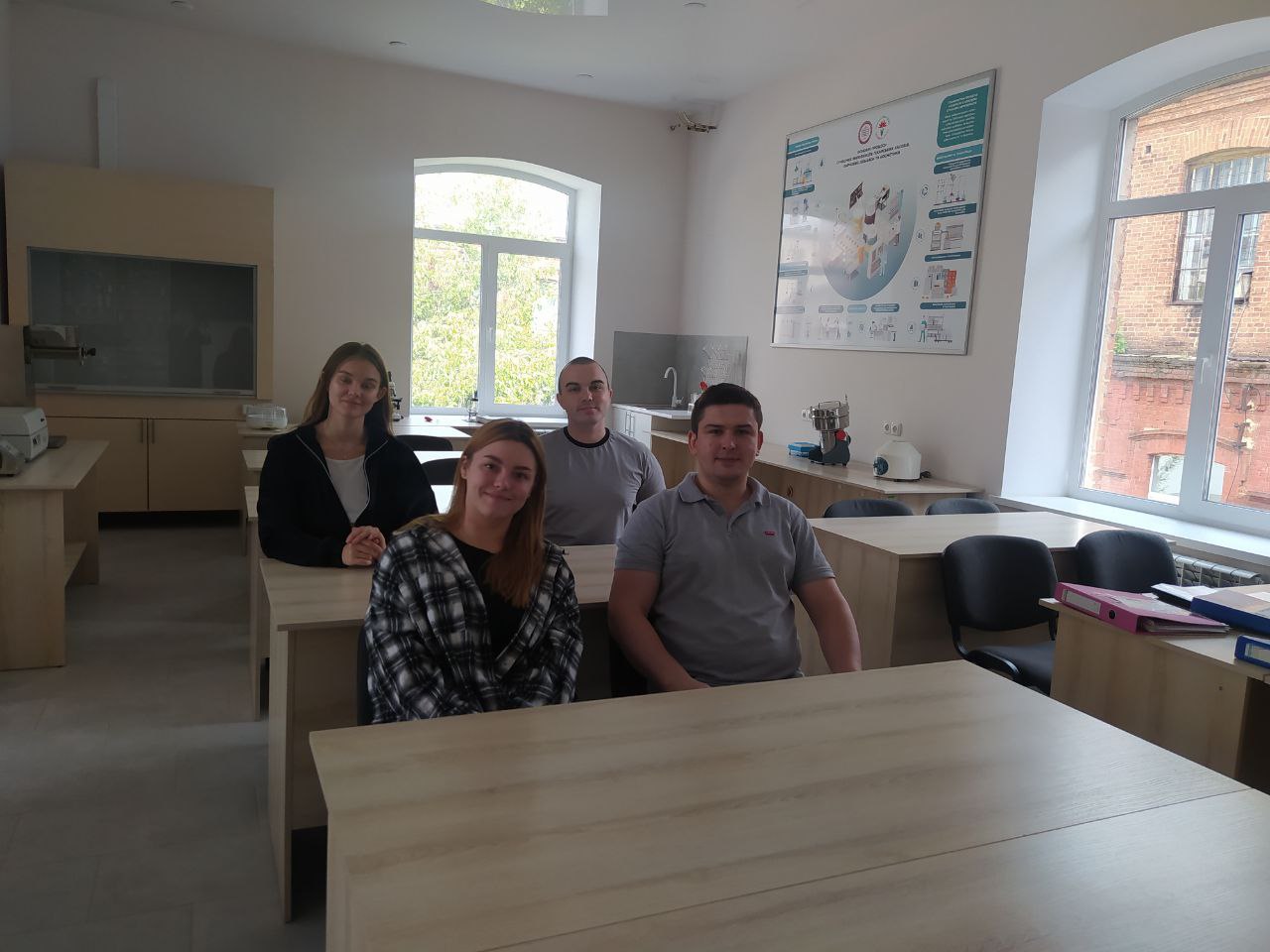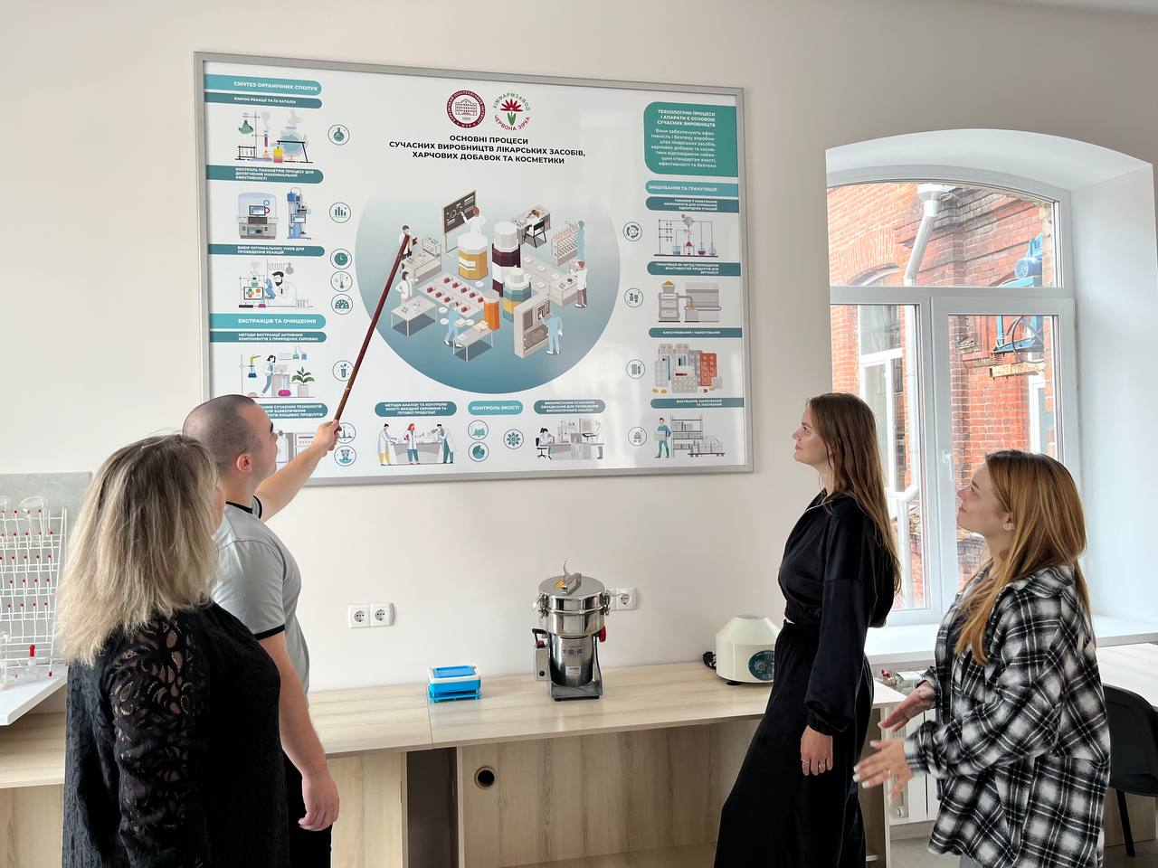 Зустріч з випускниками першого бакалаврського та другого магістерського рівня в оновленій лабораторії кафедри органічного синтезу та фармацевтичних технологій, Обговорення змін освітньої професійної програми «Технологія органічних речовин, харчових добавок та компонентів косметичних засобів». На фото випускники 2024 року Дзьох Роман – Інженер процесного інжинірингу РЛЗ,- АТ «Фармак» та Чипіжин Максим – майстер цеху СЛЗ №1, ТОВ «ХФП» Здоровʼя народу». В обговоренні приймали також участь випускники 2025 року Сімоненко Ірина та Литвиненко Крістіна.