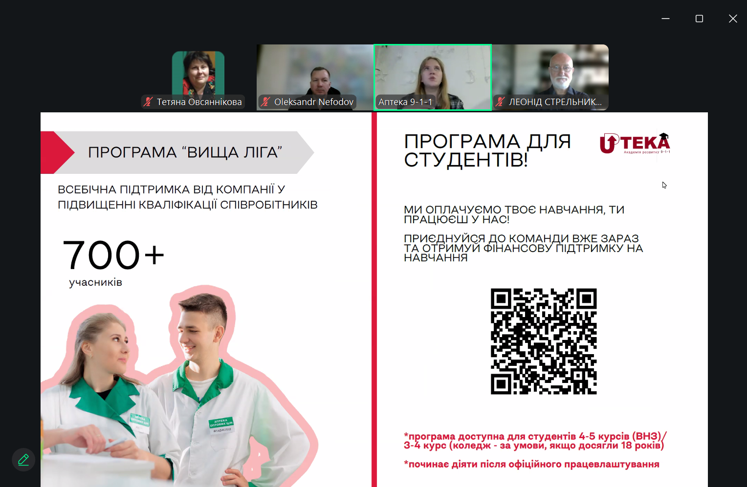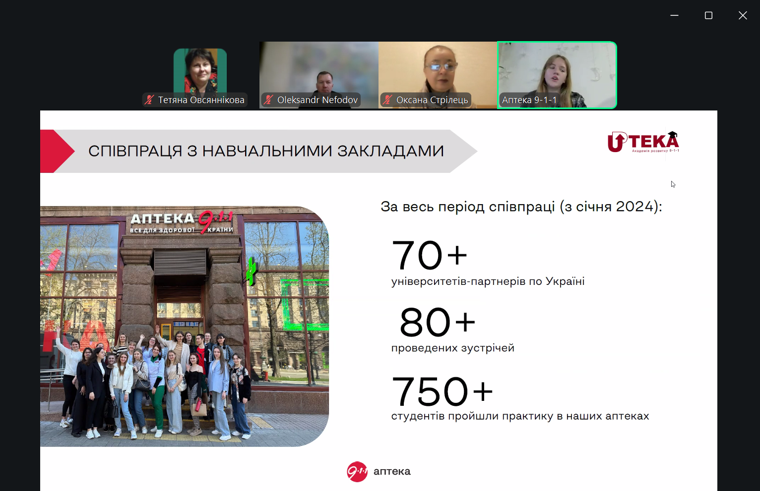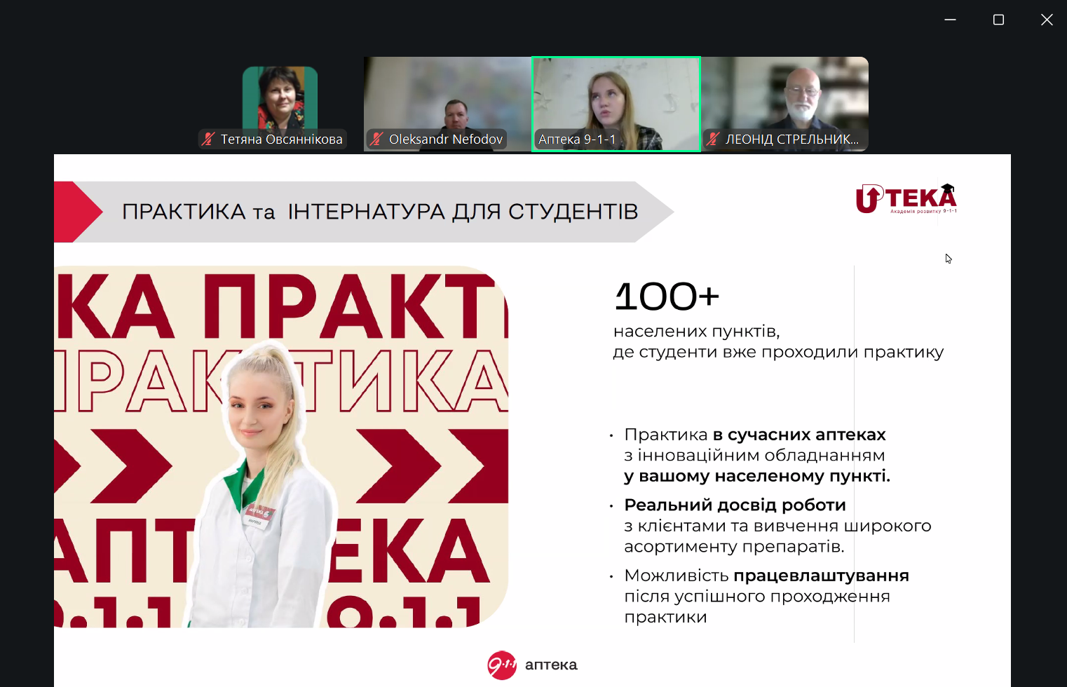 Викладачі кафедри органічного синтезу та фармацевтичних технологій професор Стрілець О.П., професор Стрельников Л.С., доцент Спиридонов С.В., доцент Фалалєєва Т.В., доцент Овсяннікова Т.О. та здобувачі ОП «Технології органічних речовин, харчових добавок та косметичних засобів», «Фармація, промислова фармація» долучилися до зустрічі з керівництвом і провідними спеціалістами мережі Аптек 9-1-1.