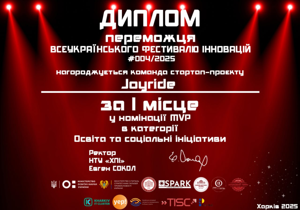 Раді поділитися чудовою новиною: стартап Joyride, що народився під час практичних занять з дисципліни «Основи управління проєктами», здобув перше місце у категорії «Освітні та соціальні ініціативи» на Всеукраїнському фестивалі інновацій 2025!
