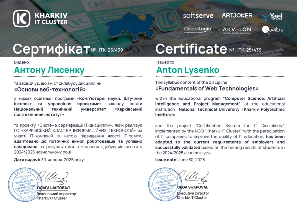 Anton Lysenko, Senior Lecturer at the Department of Project Management in Information Technologies, has successfully completed all stages of preparation and implementation to certify the course “Fundamentals of Web Technologies” through Kharkiv IT Cluster’s IT Discipline Certification System. As a result, he was awarded an official certificate confirming the course’s compliance with current industry standards.