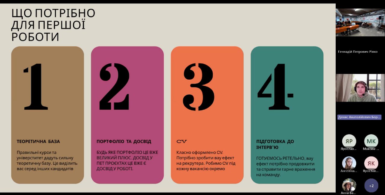 Після виступів відбулося відкрите обговорення, у межах якого студенти могли поставити запитання, отримати поради щодо побудови кар’єри, а також дізнатися про можливості стажувань і участі в міжнародних ІТ-проєктах.