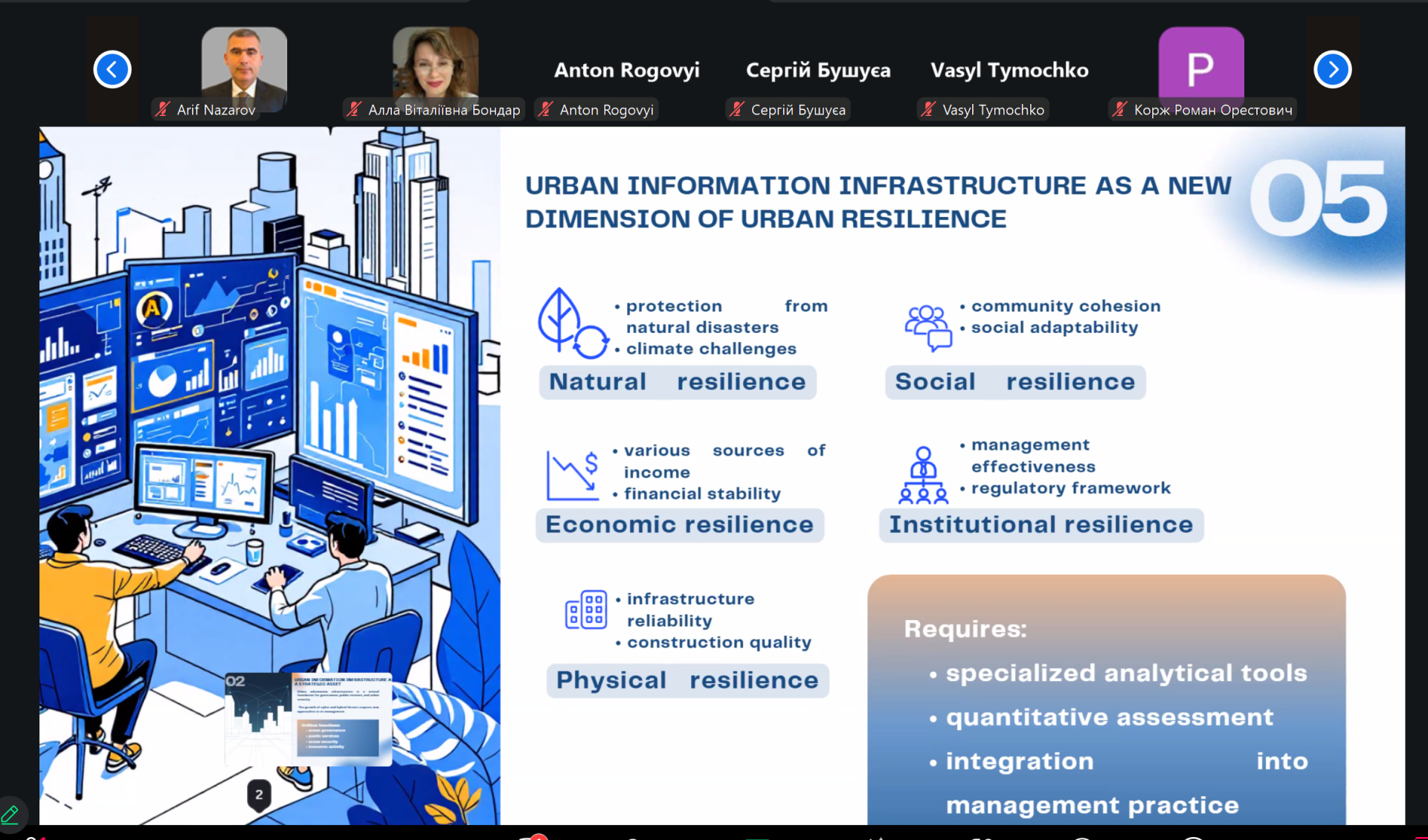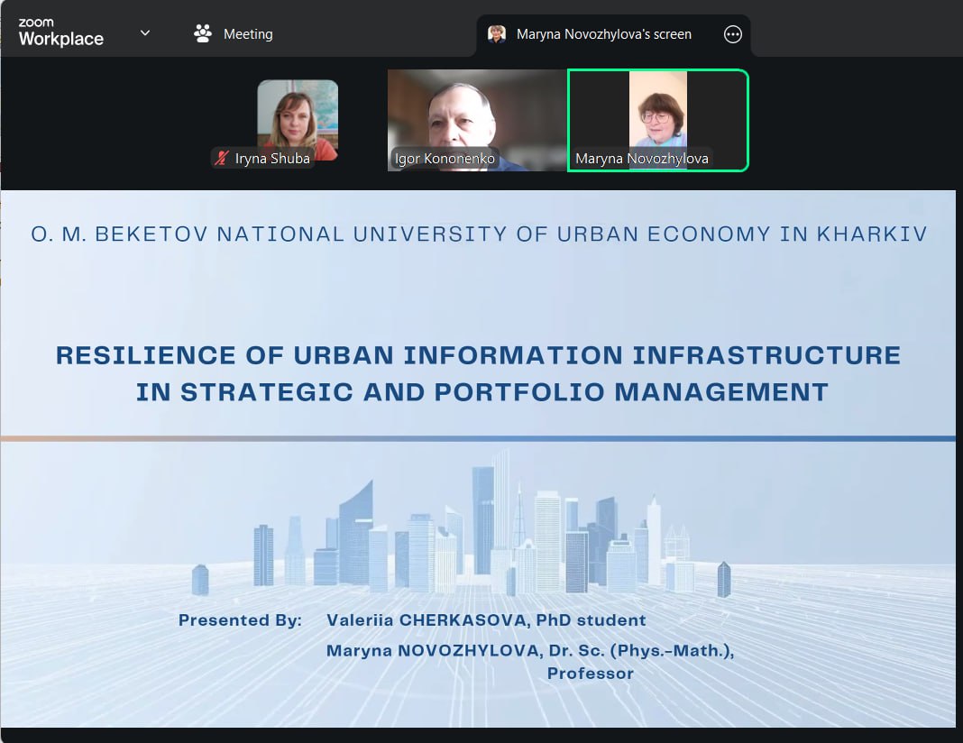 Професорка Марина НОВОЖИЛОВА, завідувачка кафедри комп’ютерних наук та інформаційних технологій Національного університету міського господарства імені О. М. Бекетова у доповіді «Стійкість міської інформаційної інфраструктури в стратегічному та портфельному управлінні» відзначила, що інтеграція концепції стійкості в управління портфелем проектів є важливою передумовою для розвитку міської інформаційної інфраструктури в умовах невизначеності. Формування портфеля базується на балансі економічної ефективності та внеску кожного проєкту в надійність системи, її адаптивність та швидкість відновлення.